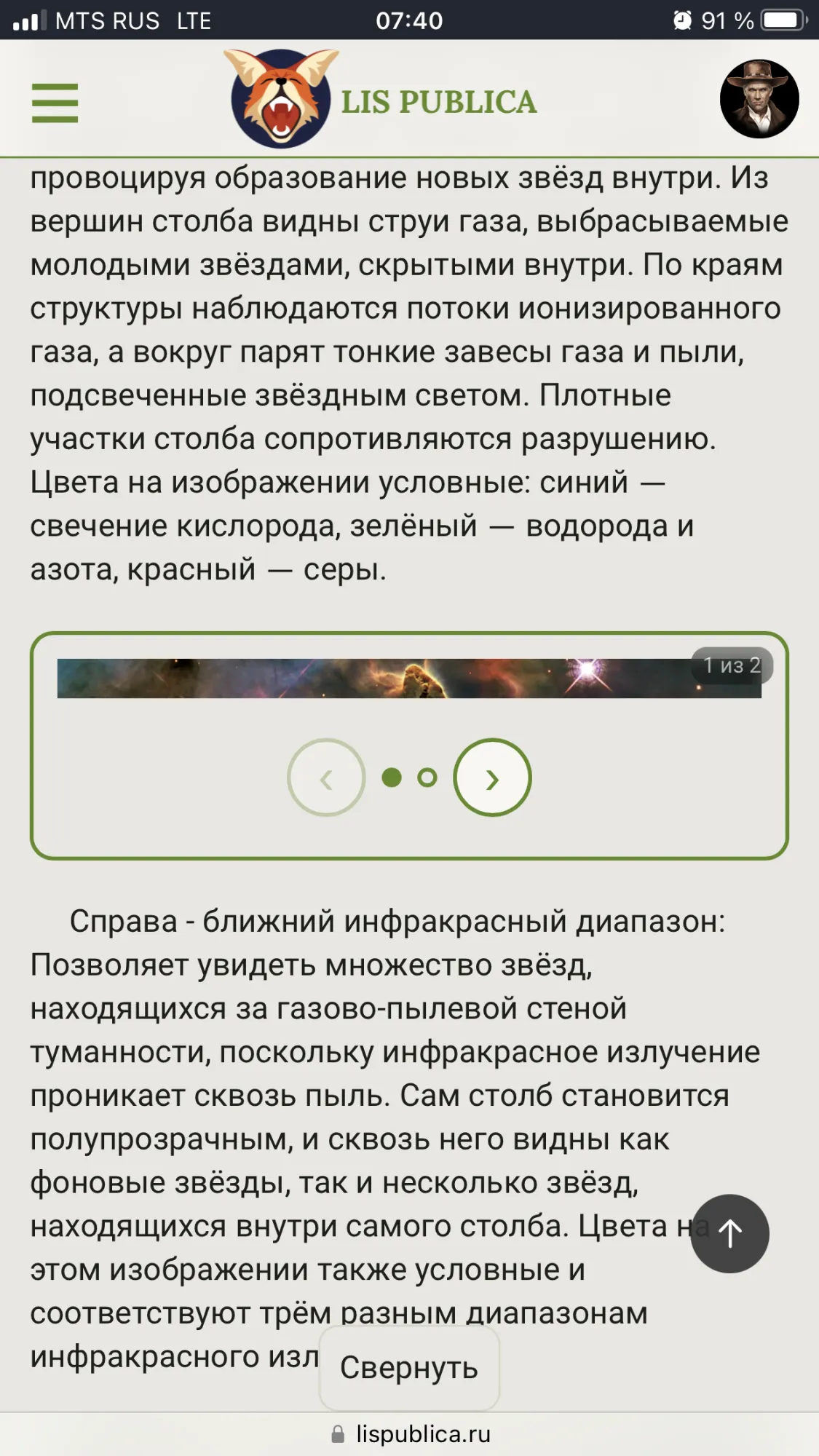 Показывает, как мощное ультрафиолетовое излучение и быстрые потоки частиц (звёздные ветры) от недавно рождённых горячих звёзд воздействуют на столб: сжимают и выдувают его, провоцируя образование новых звёзд внутри. Из вершин столба видны струи газа, выбрасываемые молодыми звёздами, скрытыми внутри. По краям структуры наблюдаются потоки ионизированного газа, а вокруг парят тонкие завесы газа и пыли, подсвеченные звёздным светом. Плотные участки столба сопротивляются разрушению. Цвета на изображении условные: синий — свечение кислорода, зелёный — водорода и азота, красный — серы.
