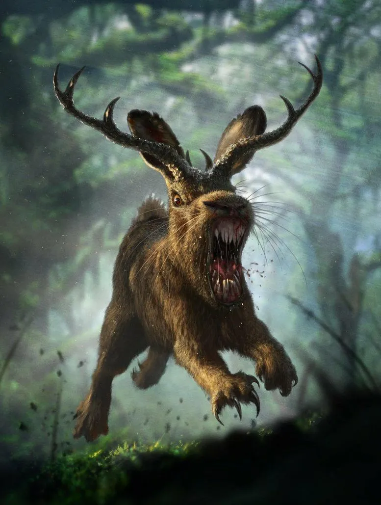 Это что еще за зверь такой? Рогатый заяц (джекалоп, зайцелоп) - вымышленное животное, которое фигурирует в фольклорных и литературных источниках. Согласно описаниям, джекалоп выглядит как кролик или заяц с оленьими рогами. В некоторых источниках упоминаются и другие особенности внешности: длинные клыки, а также среди них есть особи с лишними рожками, которые могут занимать половину или всё лицо.