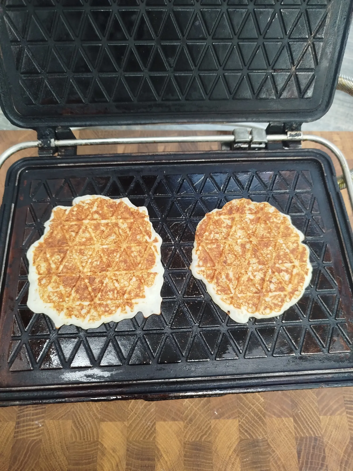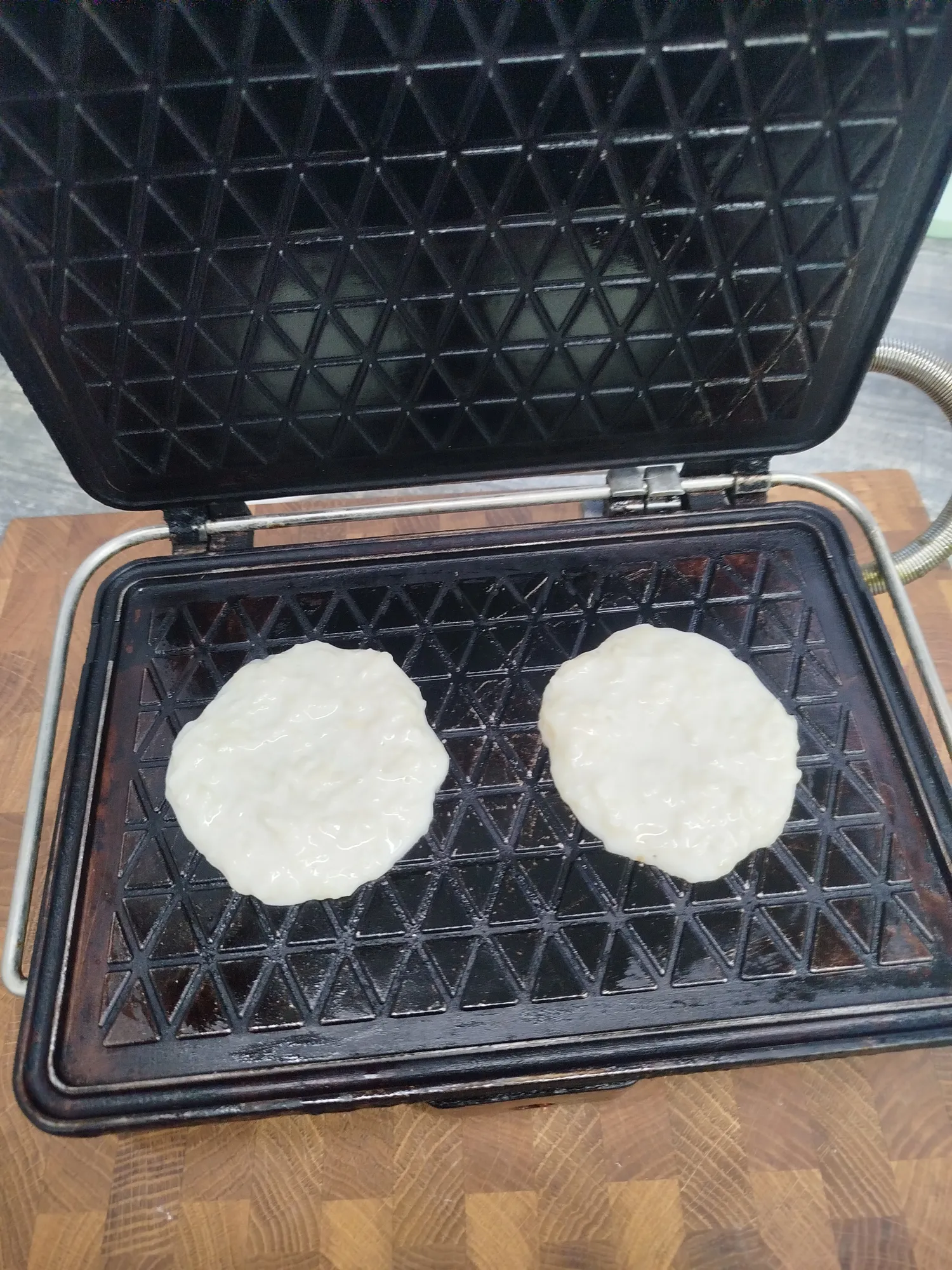 Все хорошенько перемешав и досолив берем её. Старую советскую вафельницу. Ну или обычную для венских вафель если у вас такой нет.
