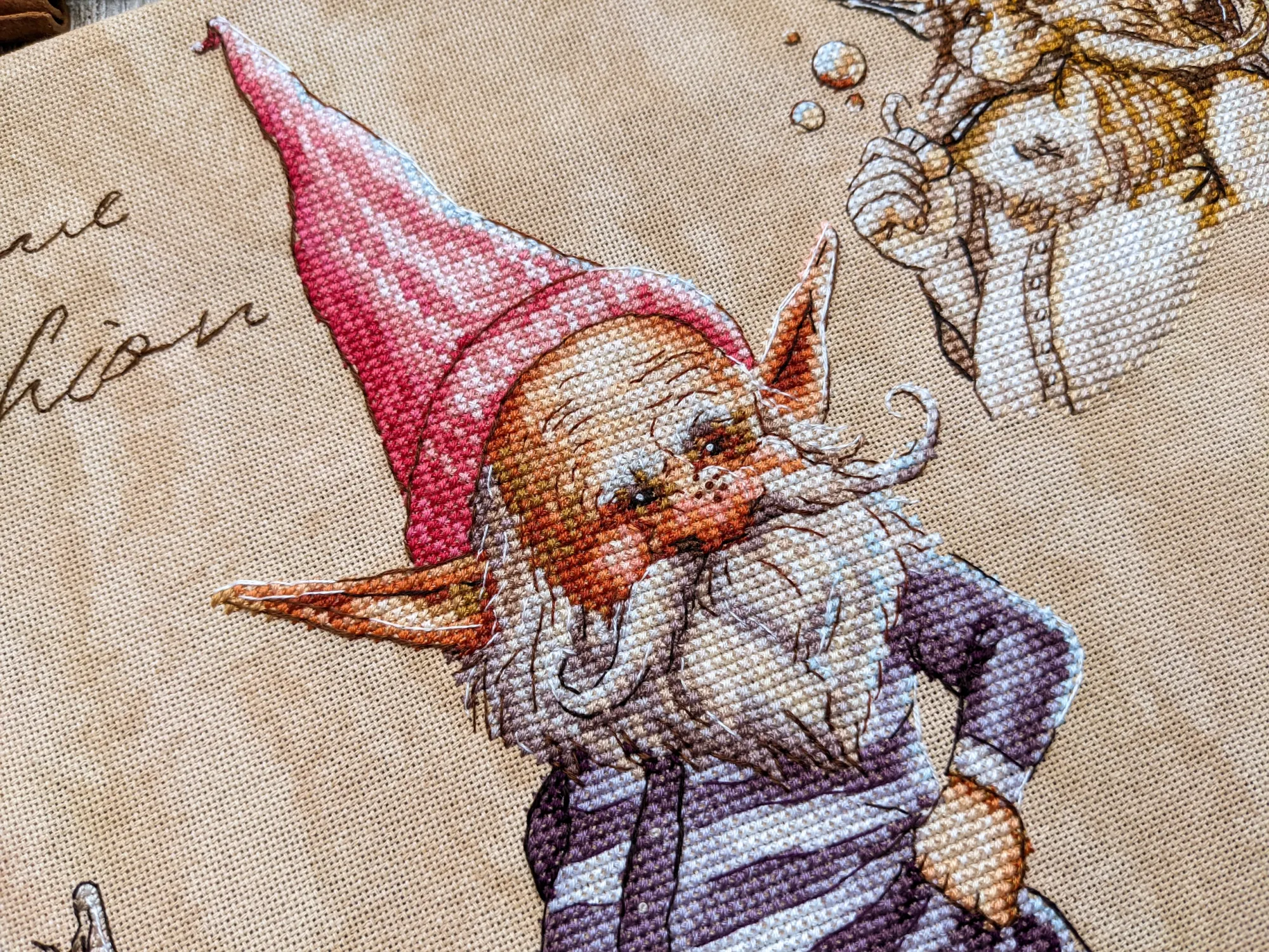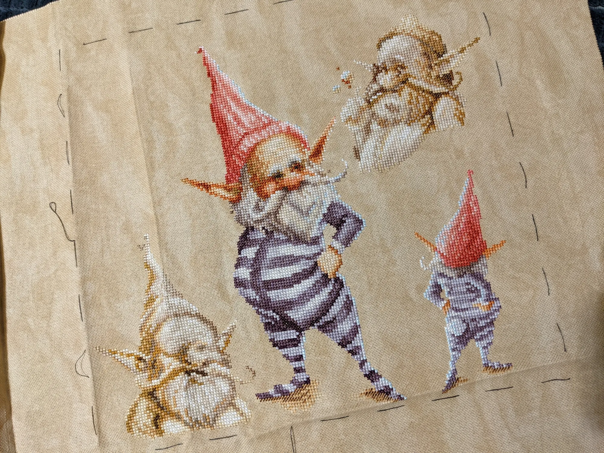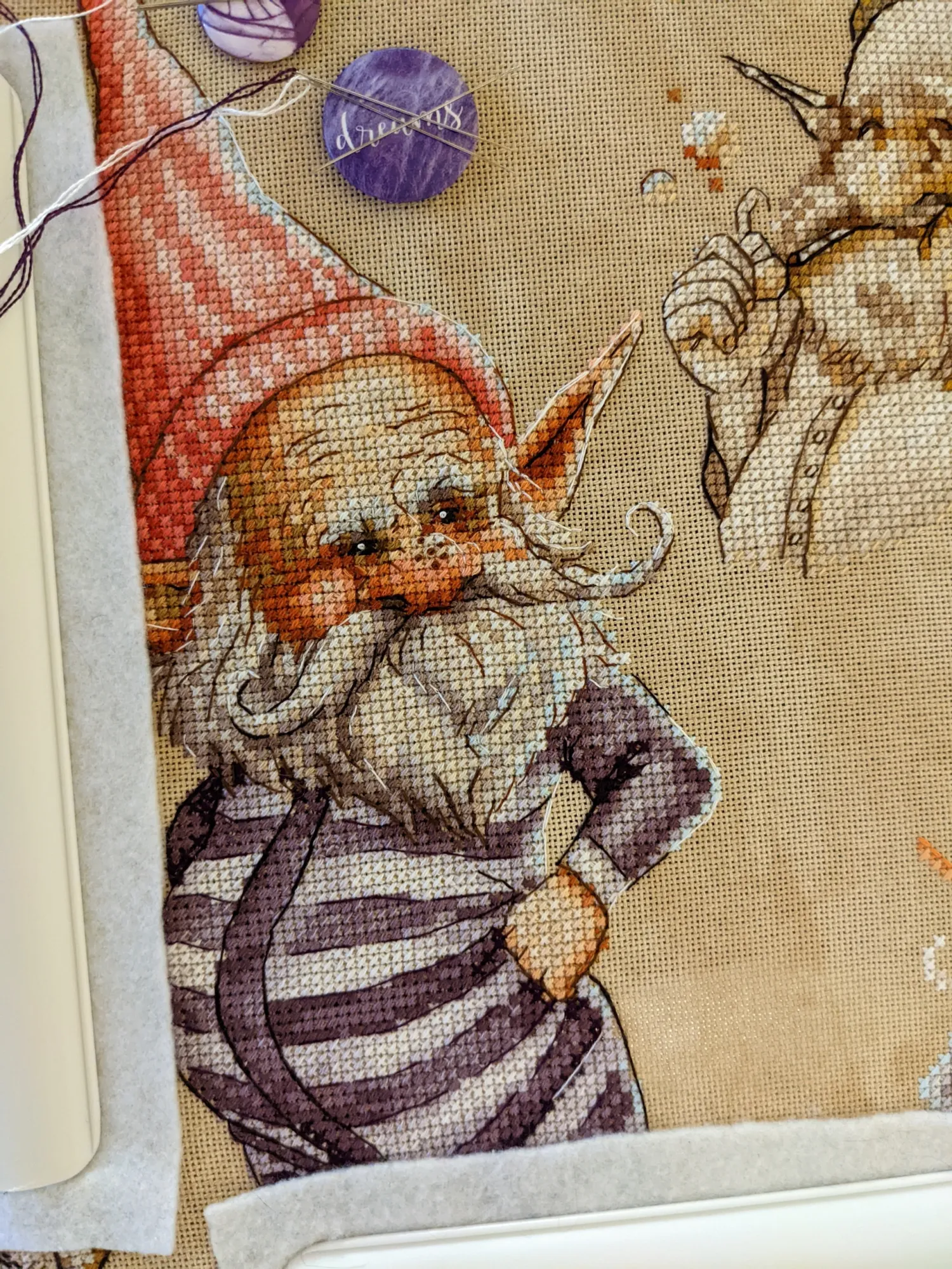 Гном кочевал со мной по городу – я вышивала в университете, пока в коридоре ждала своей очереди на нормоконтроль.