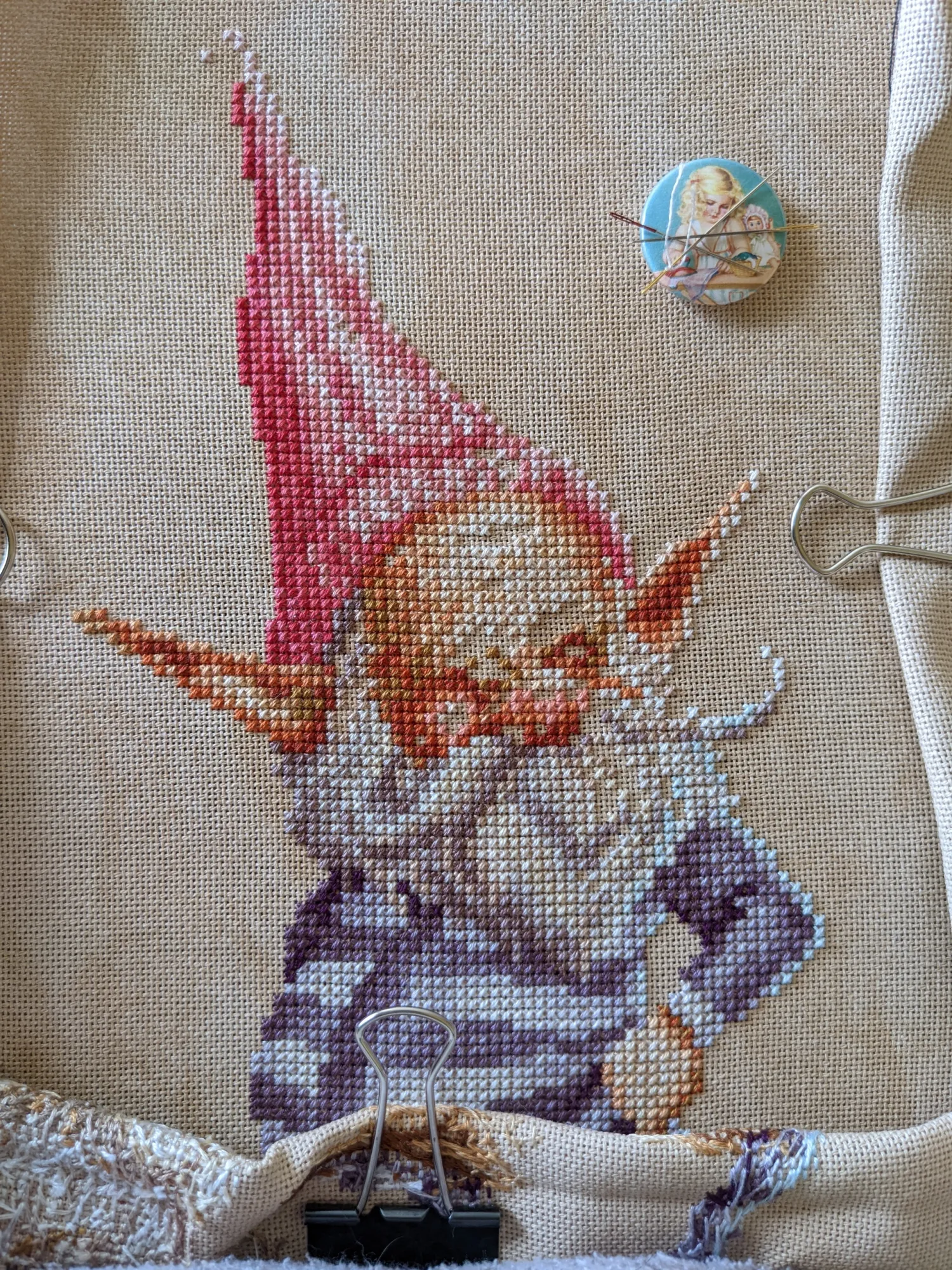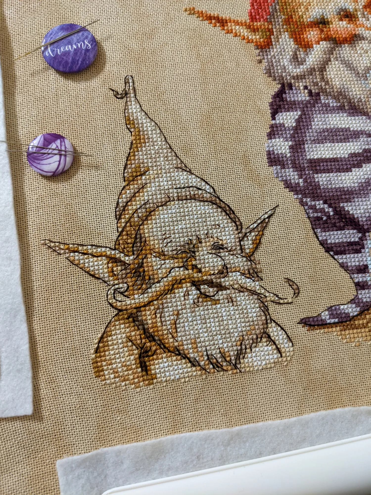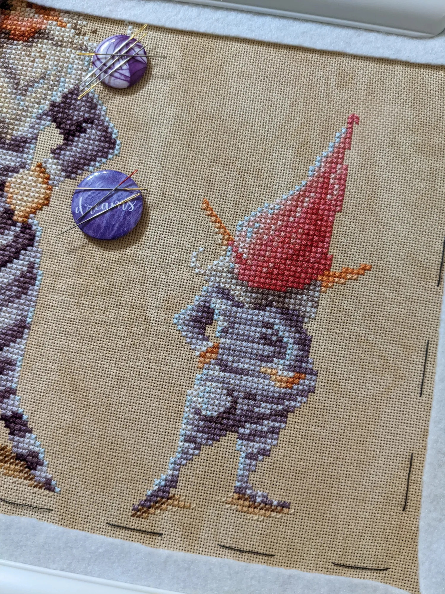 Гном кочевал со мной по городу – я вышивала в университете, пока в коридоре ждала своей очереди на нормоконтроль.
