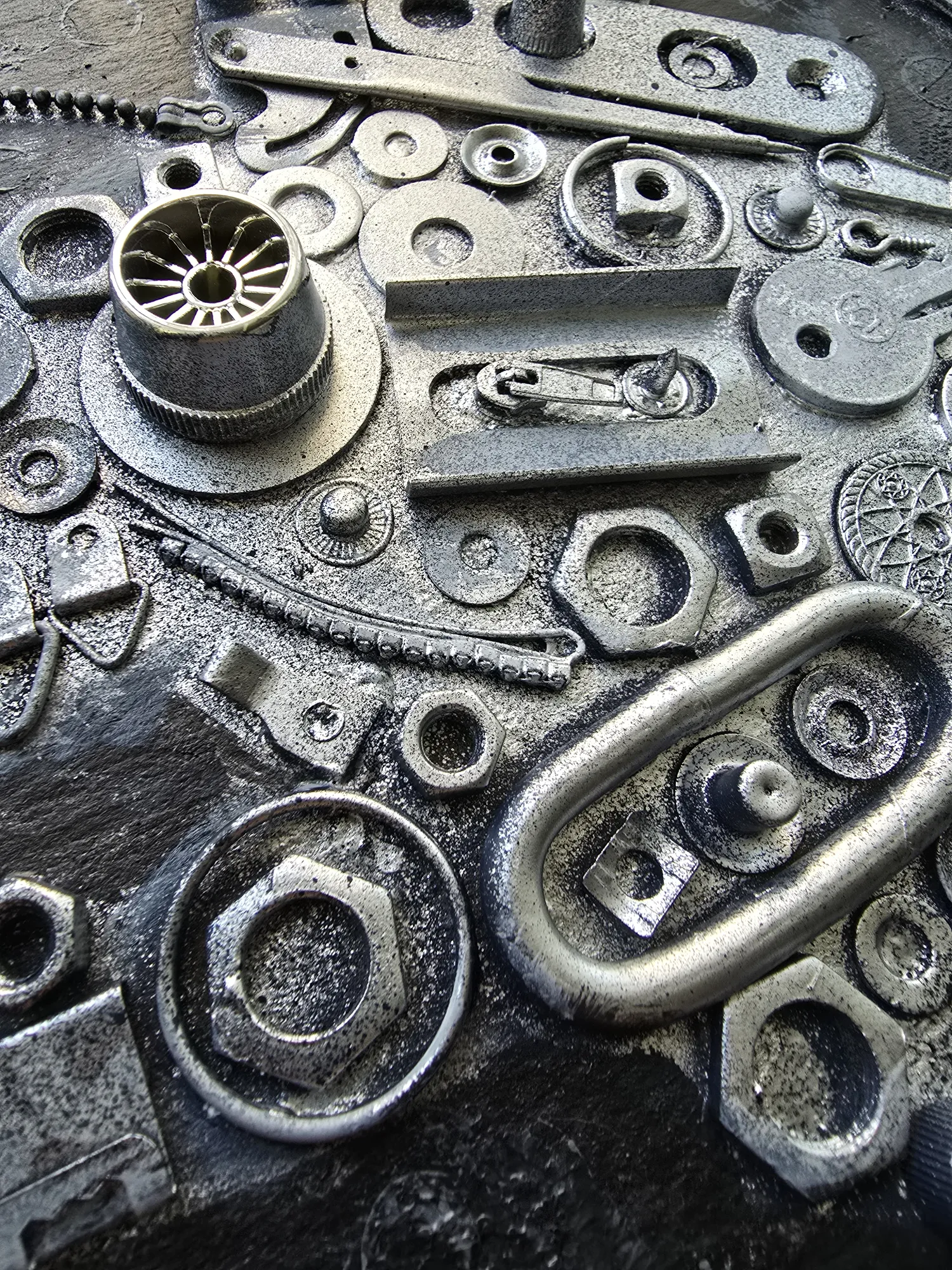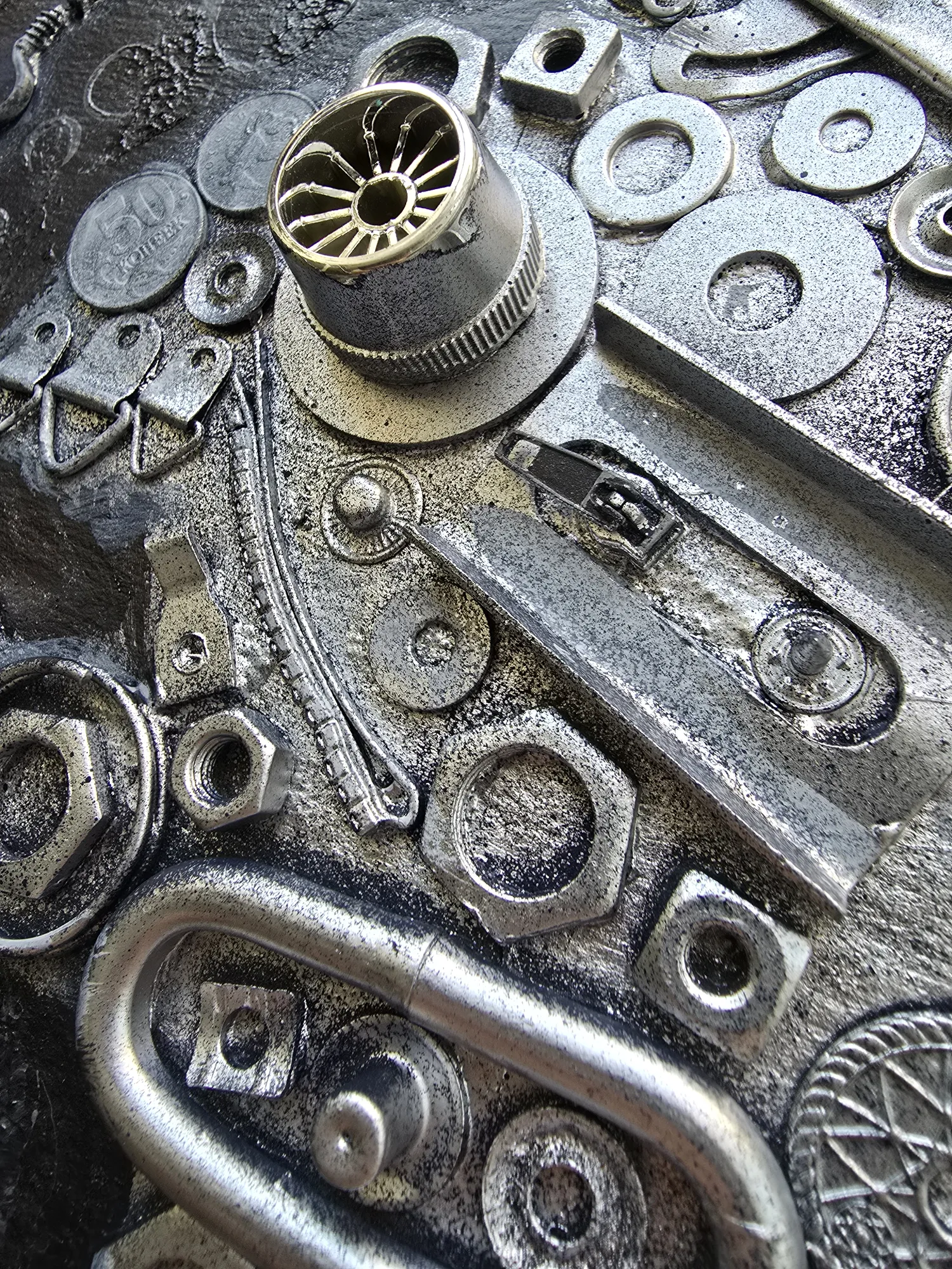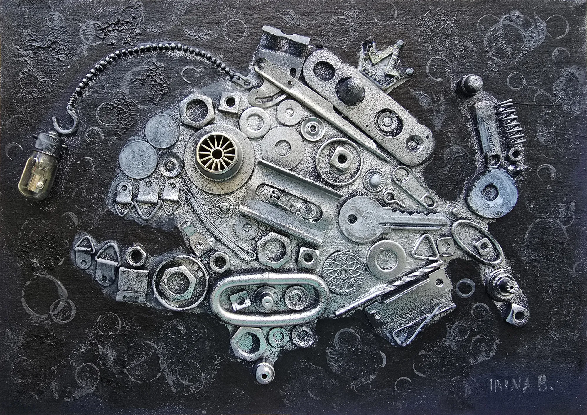 Склеивается изо всей ерунды, какая найдётся дома, в сарае, а если вы художник, которому ради искусства ничего не страшно, то и на мусорке ) Среди предметов, составляющих рыбу, можно найти ключ, который теперь уже ничего не откроет, пружинку, собачки от молнии, лампочку и даже корону от какой-то детской заколки. Я предположила, что отличные композиции получились у всех участников мастер-класса, даже не имеющих отношения к искусству, потому что составляющие клеились на картон с помощью клея Момент, и запах в помещении стоял густой. Но это только теория. Возможно сама технология предполагает создание шедевров с первого раза?