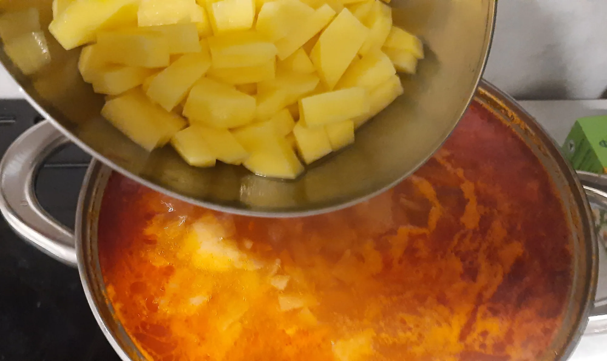 Снова доводим до кипения. Варим минут 5 и добавляем картофель. Варим до готовности картофеля, минут 15.