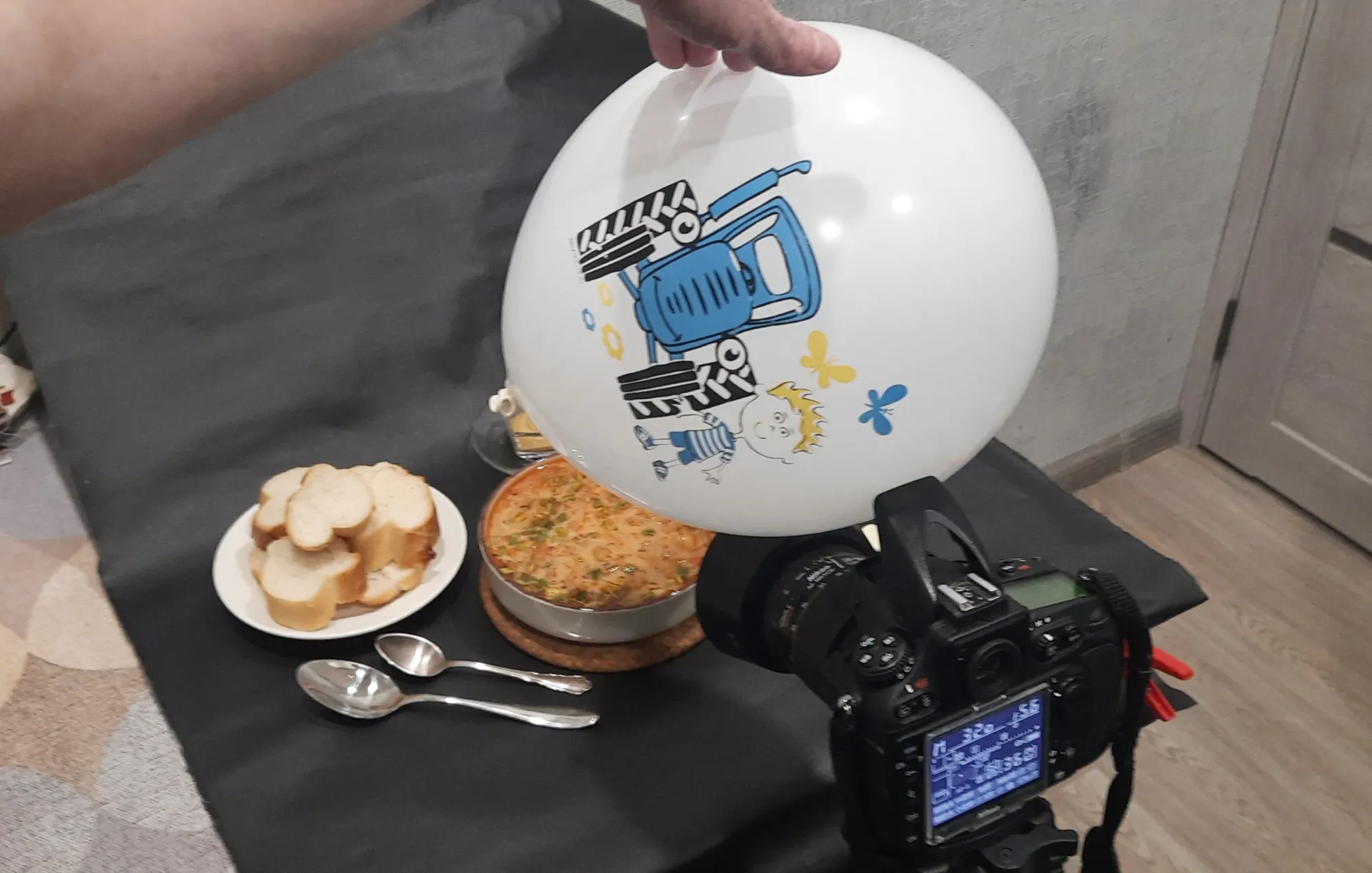 Свет, пройдя сквозь шар, рассеится и даст мягкое и равномерное освещение. Всё это применимо не только при фотографировании еды, а вобще при любой предметной съёмке. Вот как-то так:)