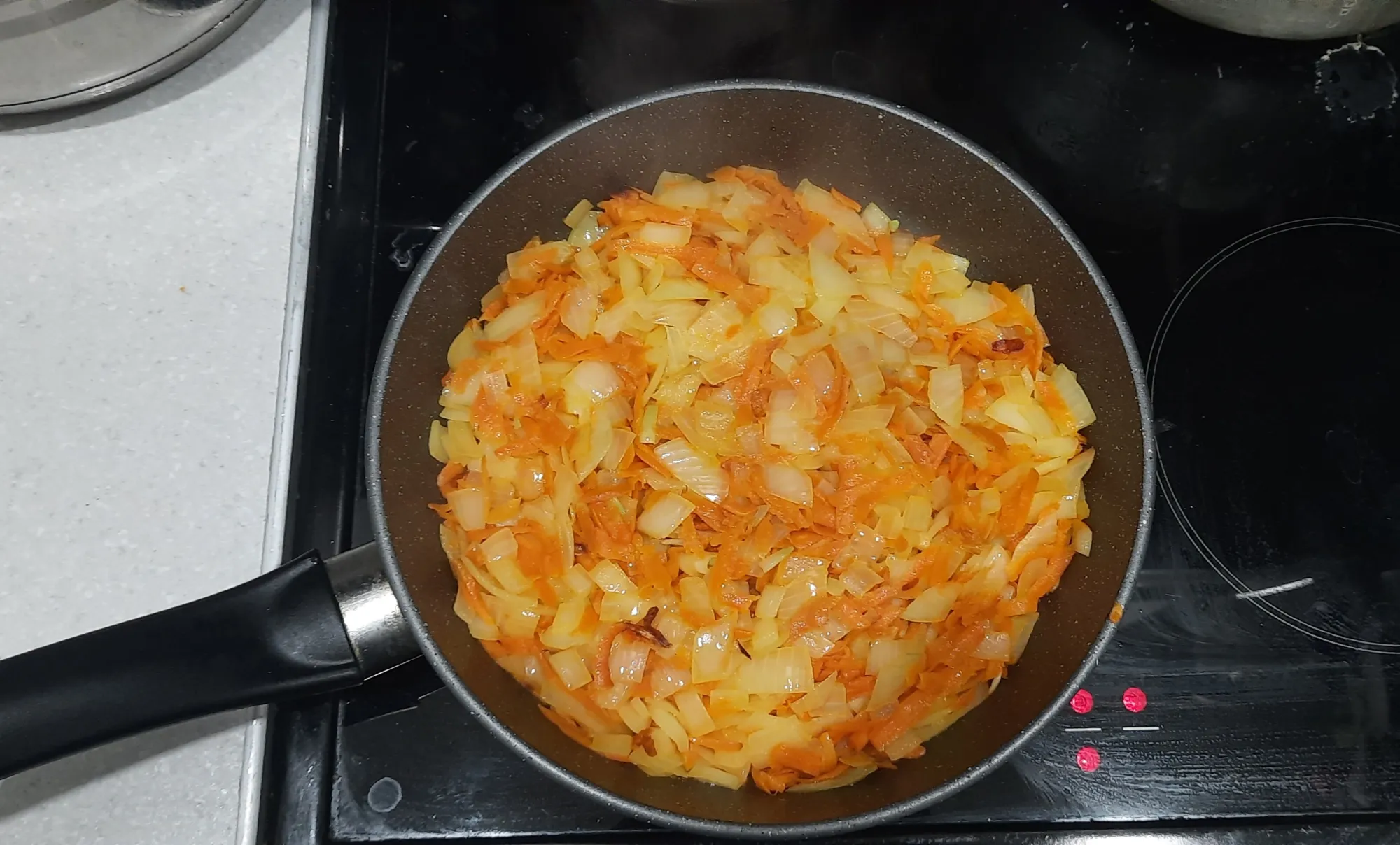 Некоторое время её пассеруем, потом добавляем лук и обжариваем вместе.