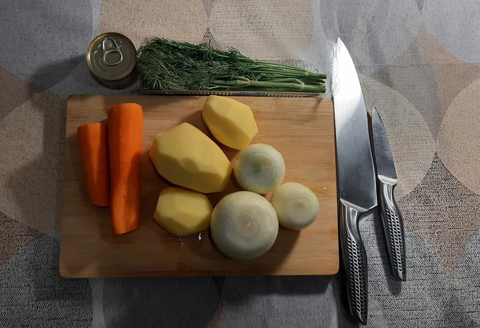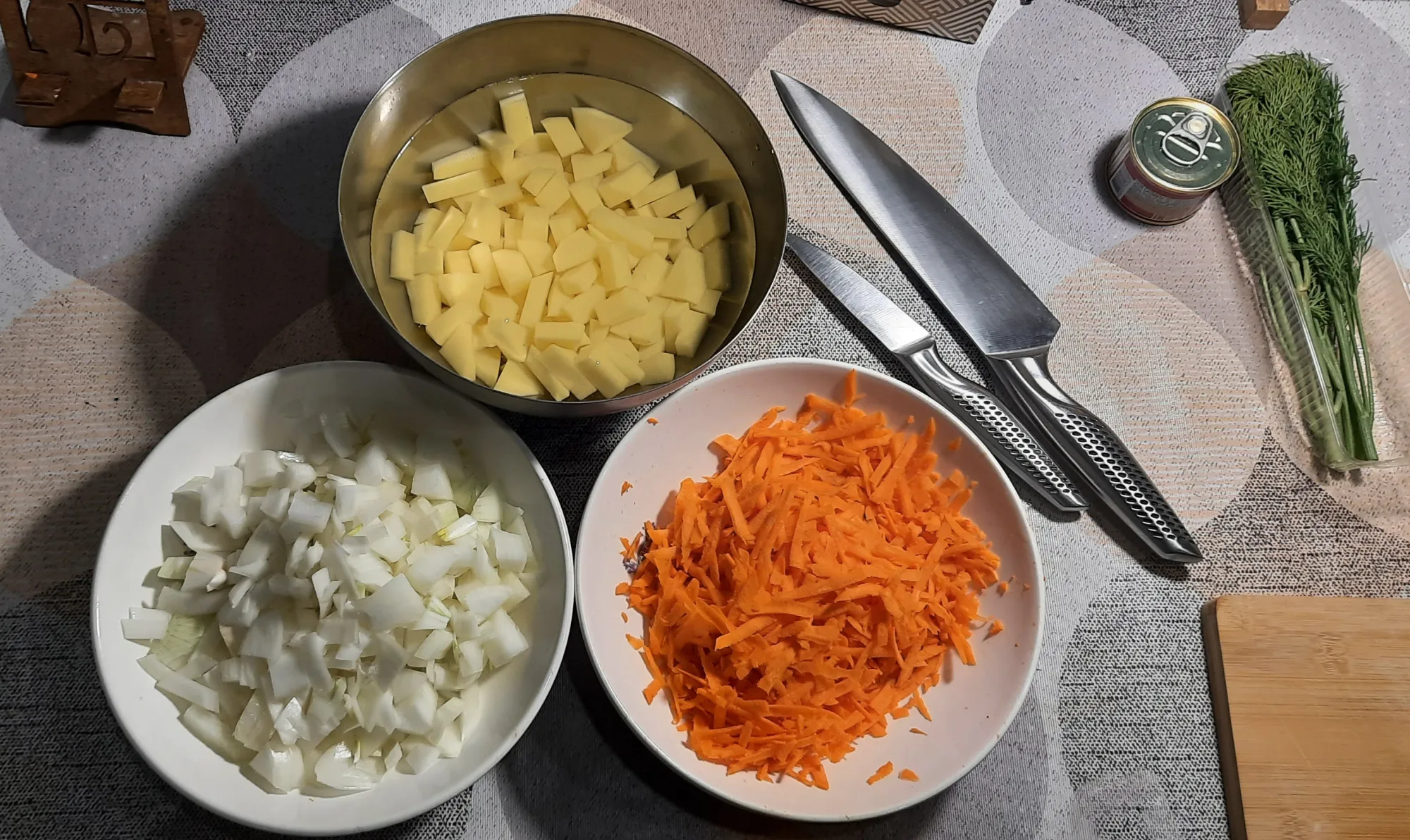 Лук и картофель режем кубиками. Берём @Nataalika 1шт. и заставляем натереть морковь на крупной тёрке. Ибо это процесс муторный, такими приземлёнными вещами нам заниматься некогда, мы тут кулинарную магию творим:)