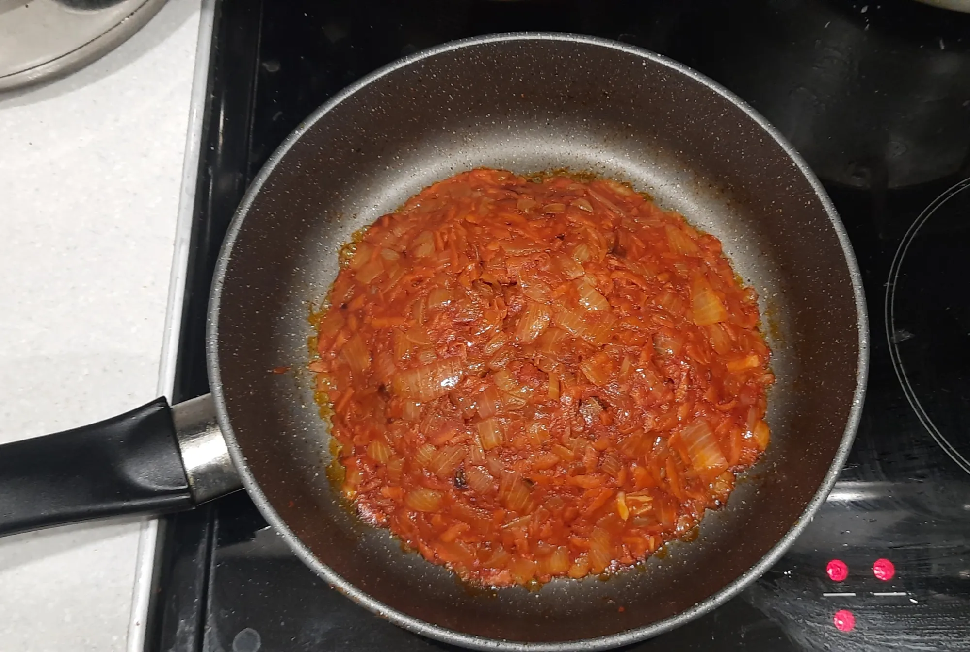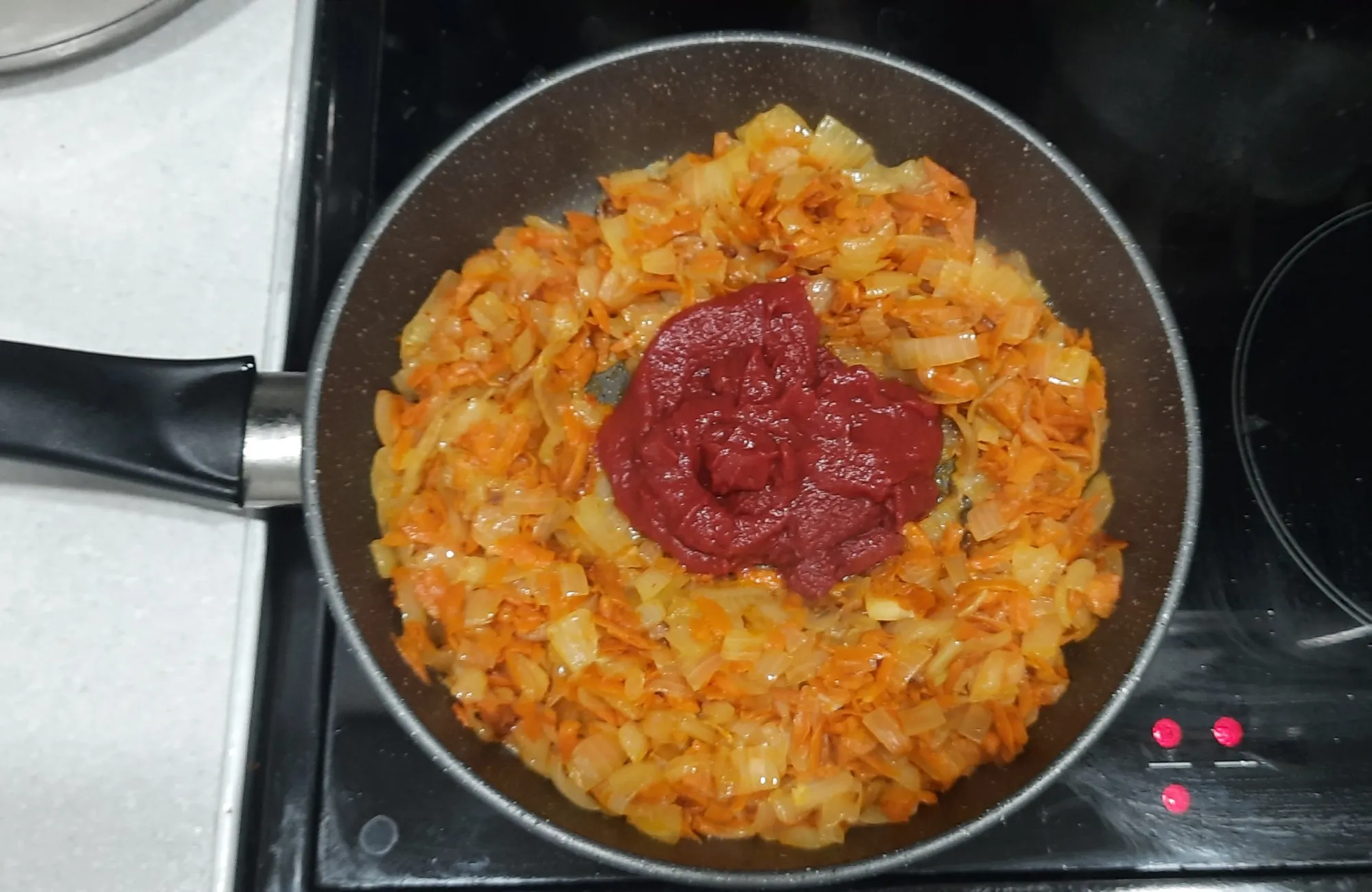 Обжариваем ещё немного, сдвигаем к краям, в центр добавляем томатную пасту.