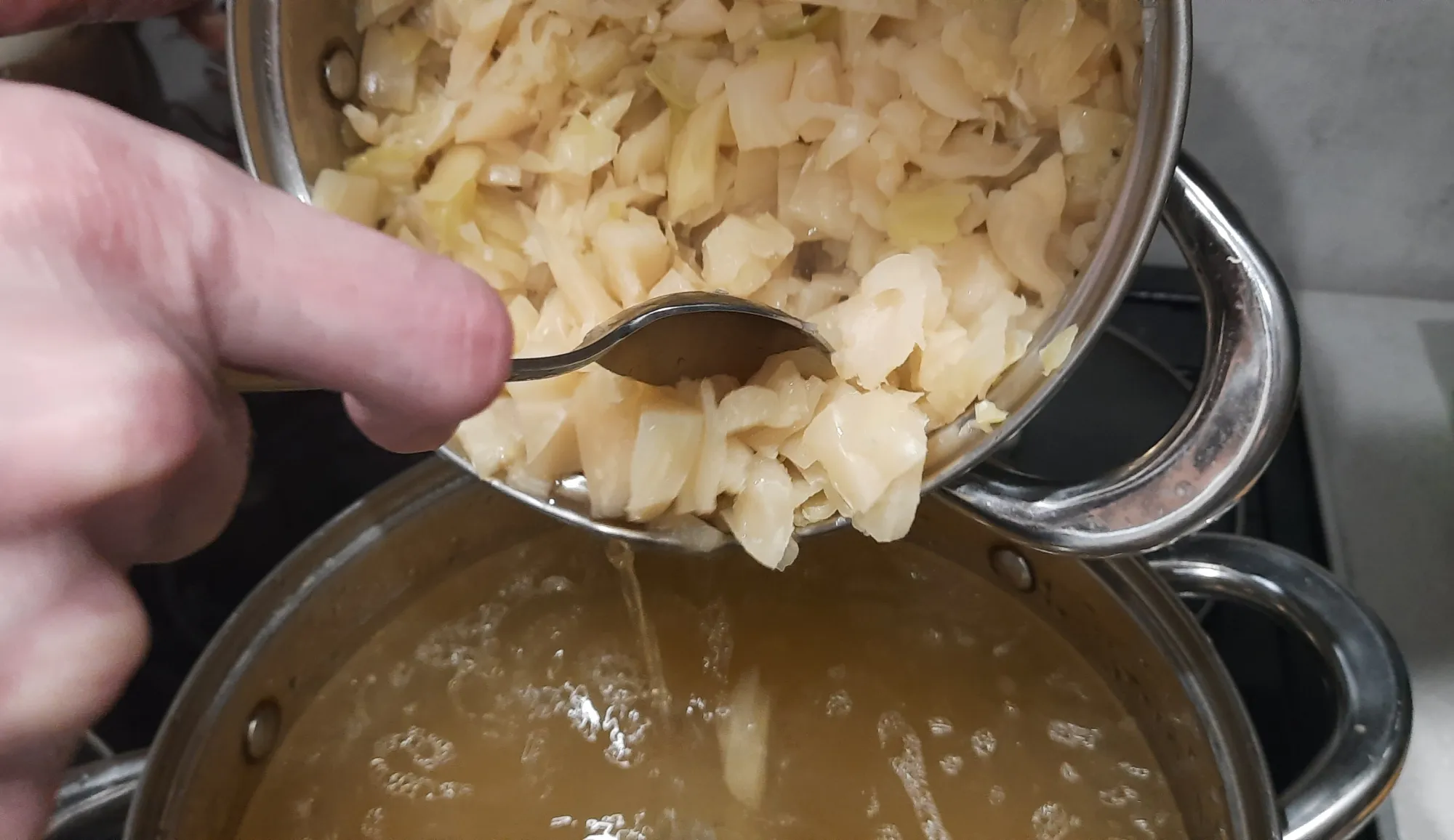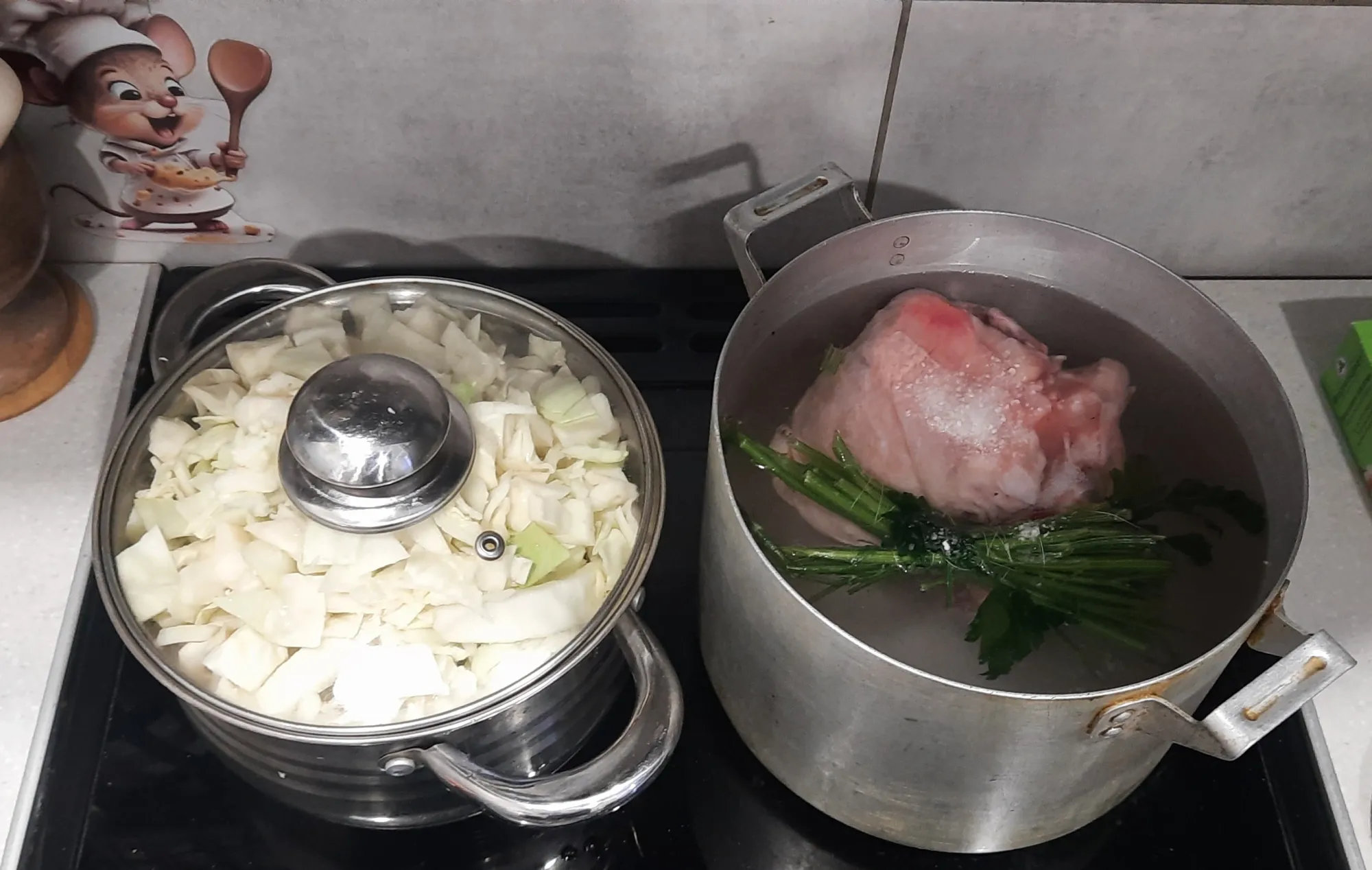 Начинаем с варки бульона в технологической кастрюле. Бульон солю сразу. Традиционно добавляю при варке стебли укропа и петрушки, по пучку и несколько горошин чёрного перца. Одновременно в соседней кастрюле ставлю вариться нашинкованную капусту, один маленький кочан, или половину большого. Капусту варю параллельно, потому как люблю её в супе совсем мягенькую, разваренную, как раньше в постсоветских столовках! Бульон варю 1,5 часа, капусту минут 40. В капусту при варке добавляю немного соли и сахара, чтобы усилить вкус.