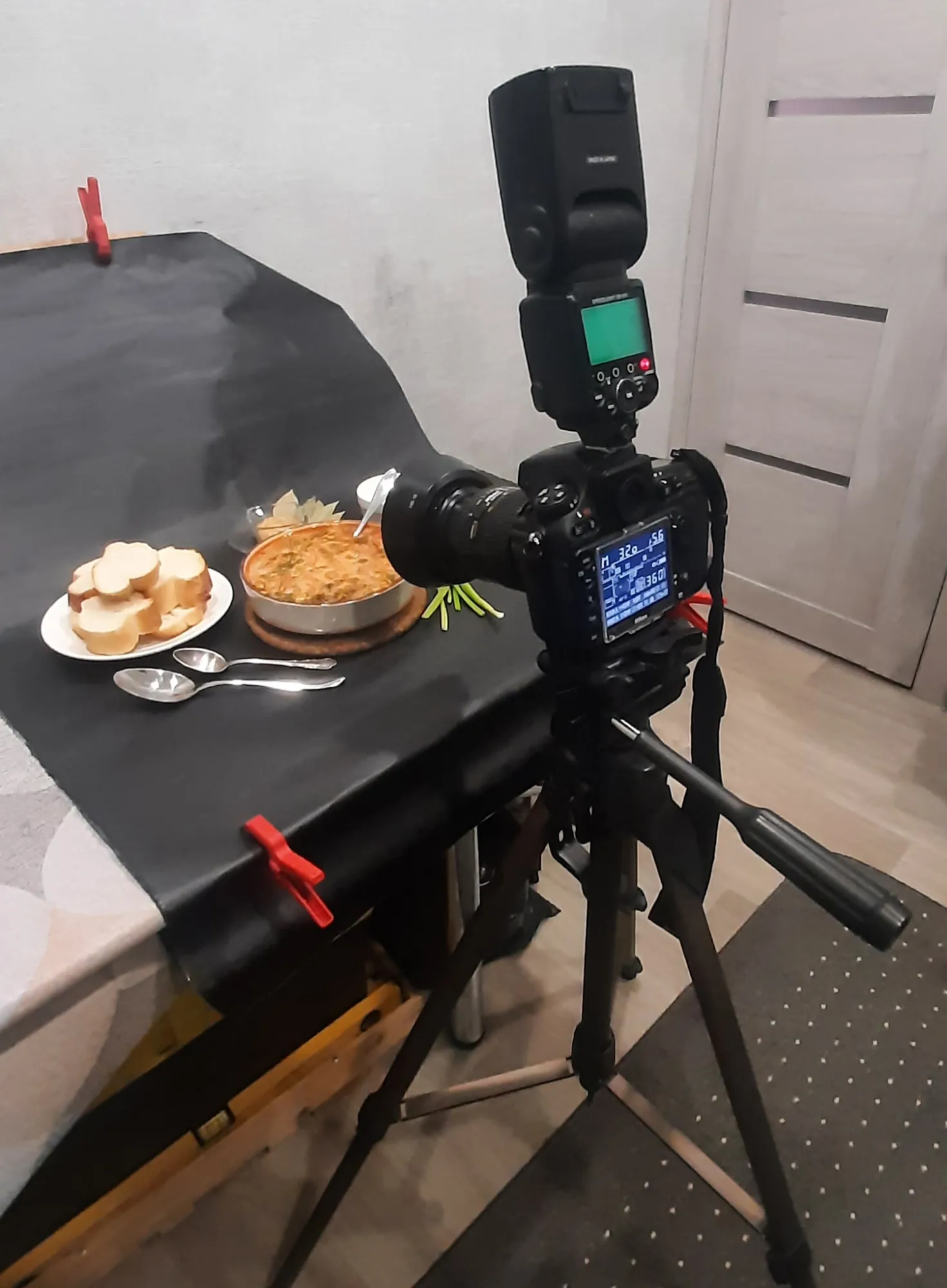 Отдельно для @Kukabara - всё совсем несложно, даже в условиях маленькой кухни. Берём фон и закрепляем его на столе прищепками. В моём случае это модельные зажимы для сосков. В качестве фона у мну среднематовая бумага для упаковки полиграфической плёнки. Я её взял просто потому что она у меня есть, это по сути, вообще мусор. Но обычный фотофон метр на два стоит 200 рублей на озонах:)