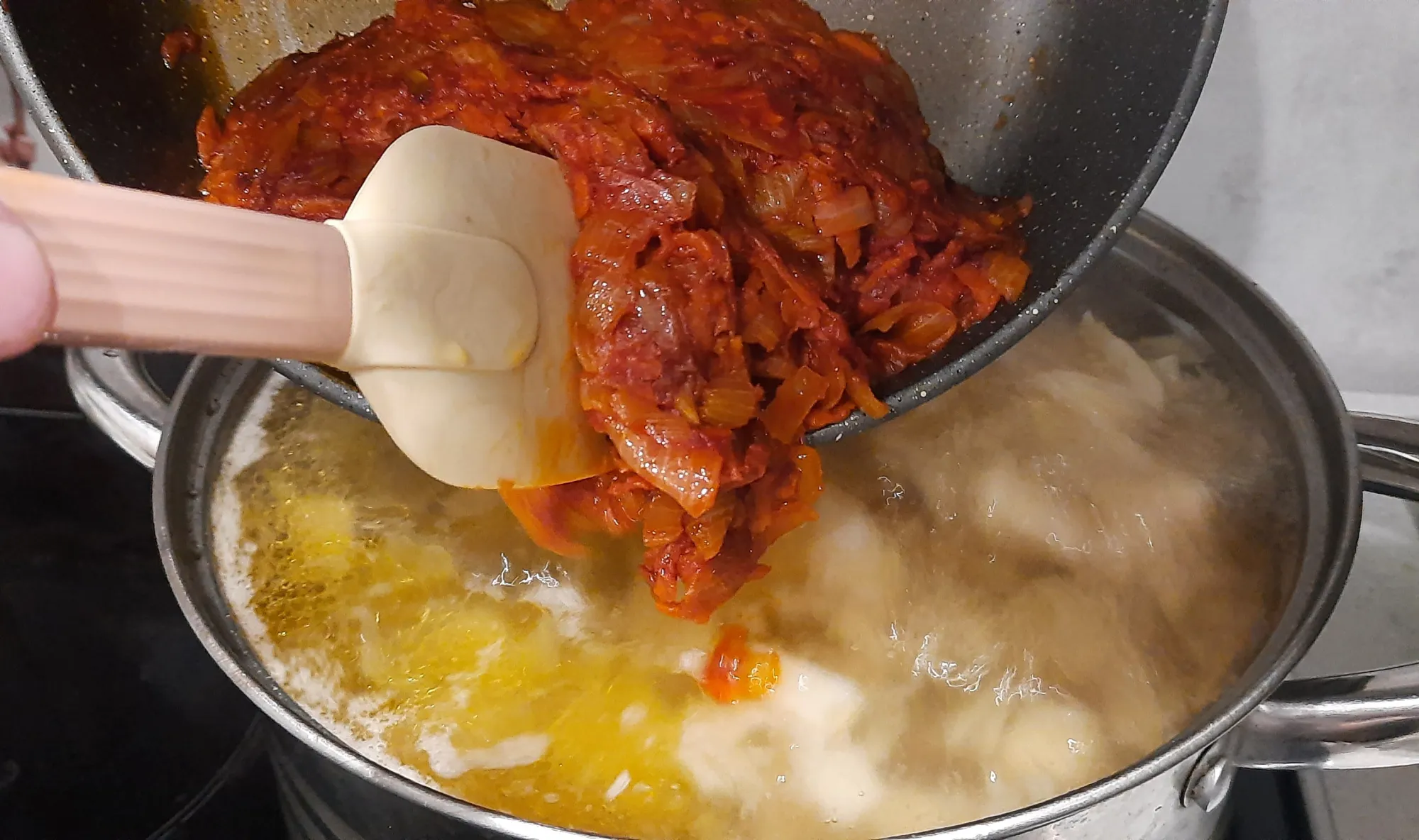 Вновь ставим на огонь, даём закипеть. Добавляем зажарку.