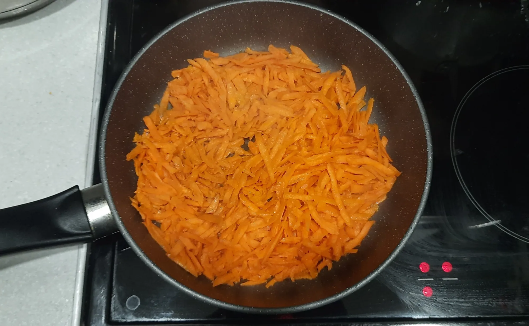 Делаем зажарку. Опять же классическим способом. Разогреваем сковороду с растительным маслом, вываливаем морковь