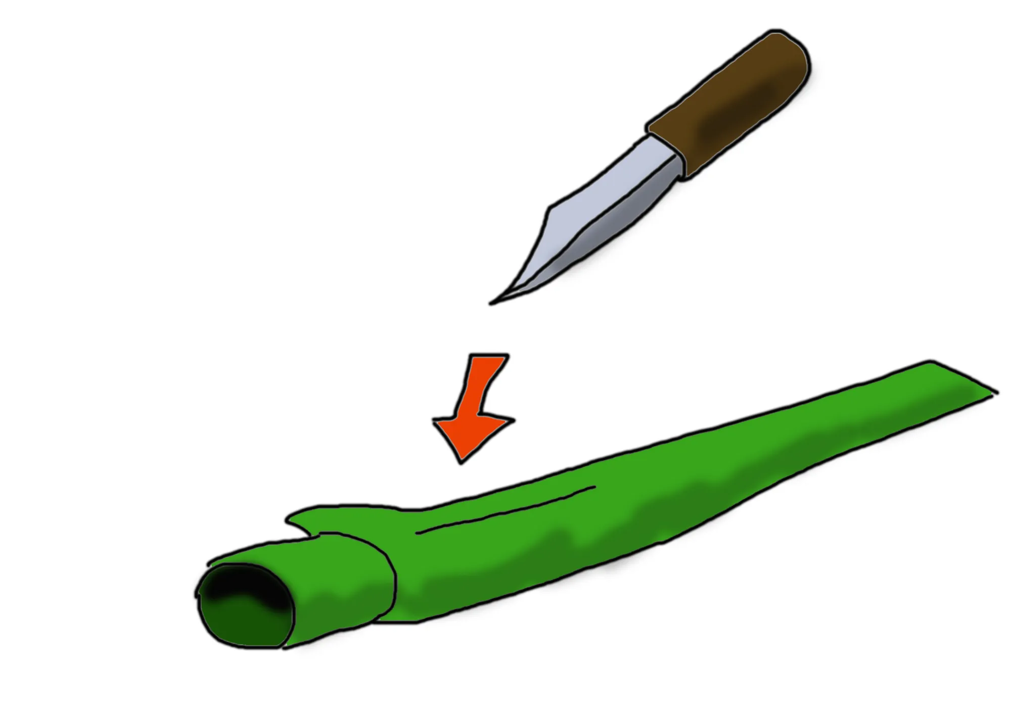 Всё просто. Стебель борщевика растёт секциями. Отрезаем острым ножом чуть ниже одной и второй "перемычек" там, где стебель наиболее толстый. И делаем тонкий надрез. Я хз как объяснить. Нарисую примитивно