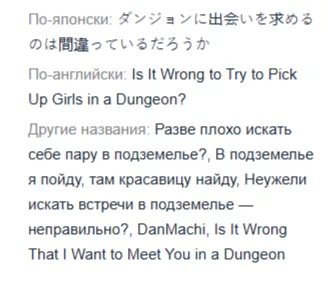 Я японский, честно, не знаю, потому по достоверности перевода ничего не могу сказать. Статья эта в вики вызывает ряд вопросов, особенно, "В подземелье я пойду, там красавицу найду". Тайтл этот не знаю, поиск осуществлял по первому английскому названию, именно такие варианты он и выдал. И MangaLib все же для меня достаточно авторитетный источник, при этом "правильный" перевод с английского первого варианта "Правильно ли пытаться снять девушек в данжене?", второй вариант со второго английского варианта "Правильно ли, что я хочу встретиться с тобой в данжене?" Сорри за данжен, эрпэгэшная привычка. Меня бы устроил любой перевод в статье, так как транслитерация английская с японского мне ничего не дает, пусть и с линком. Вообще спор не стоит выеденного яйца, он глупый изначально. Ты ТС, тебе виднее, я высказал лишь свое мнение