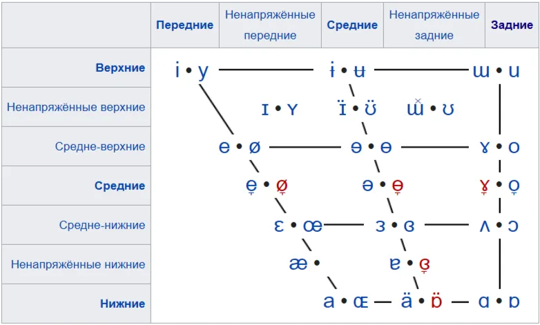 Здесь отображено, как двигается наш язык при произнесении звука. Есть ряд (передний, средний, задний), есть подъём (верхний, средний, нижний).