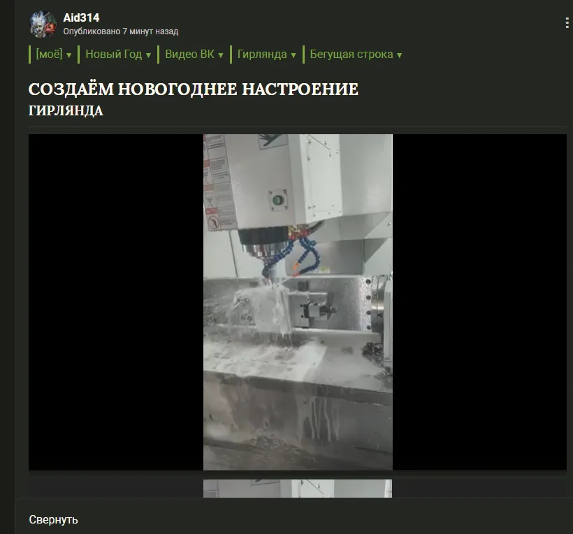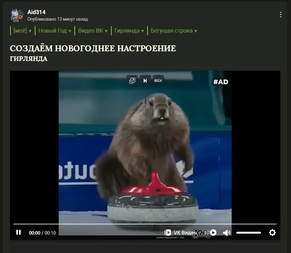 Aid314 Опубликовано 2 недели назад [моё] [Сокровищница] Новый Год Видео ВК Гирлянда Бегущая строка Создаём новогоднее настроение Гирлянда Читать дальше...