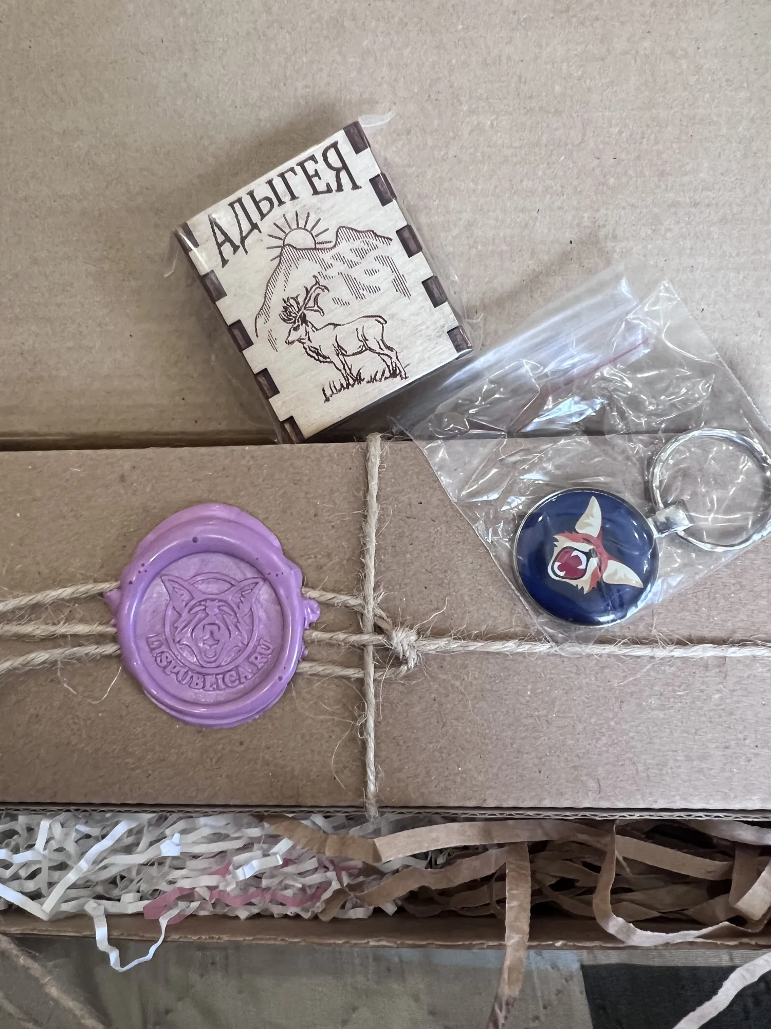Значит восторг начался еще в сдэке - коробка вся вся в разных печатях с лисичкой)) дома восторг усилился многократно - и сургучная печать, и брелочек, и сувенир из Адыгеи, и наклеечки, и календарь!