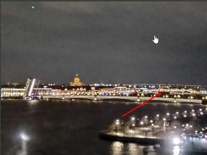 Ага, Дворцовый, самый известный. А правее и чуть выше излом в желтых фонариках - это следующий разводить начали. Я сама еле разглядела, но на других фото прям дырка в фонарях на этом месте получалась :). Но на него мы и не рассчитывали, в основном Троицкий видно и Литейный. И прогулочные корабли снуют туда-сюда толпами.