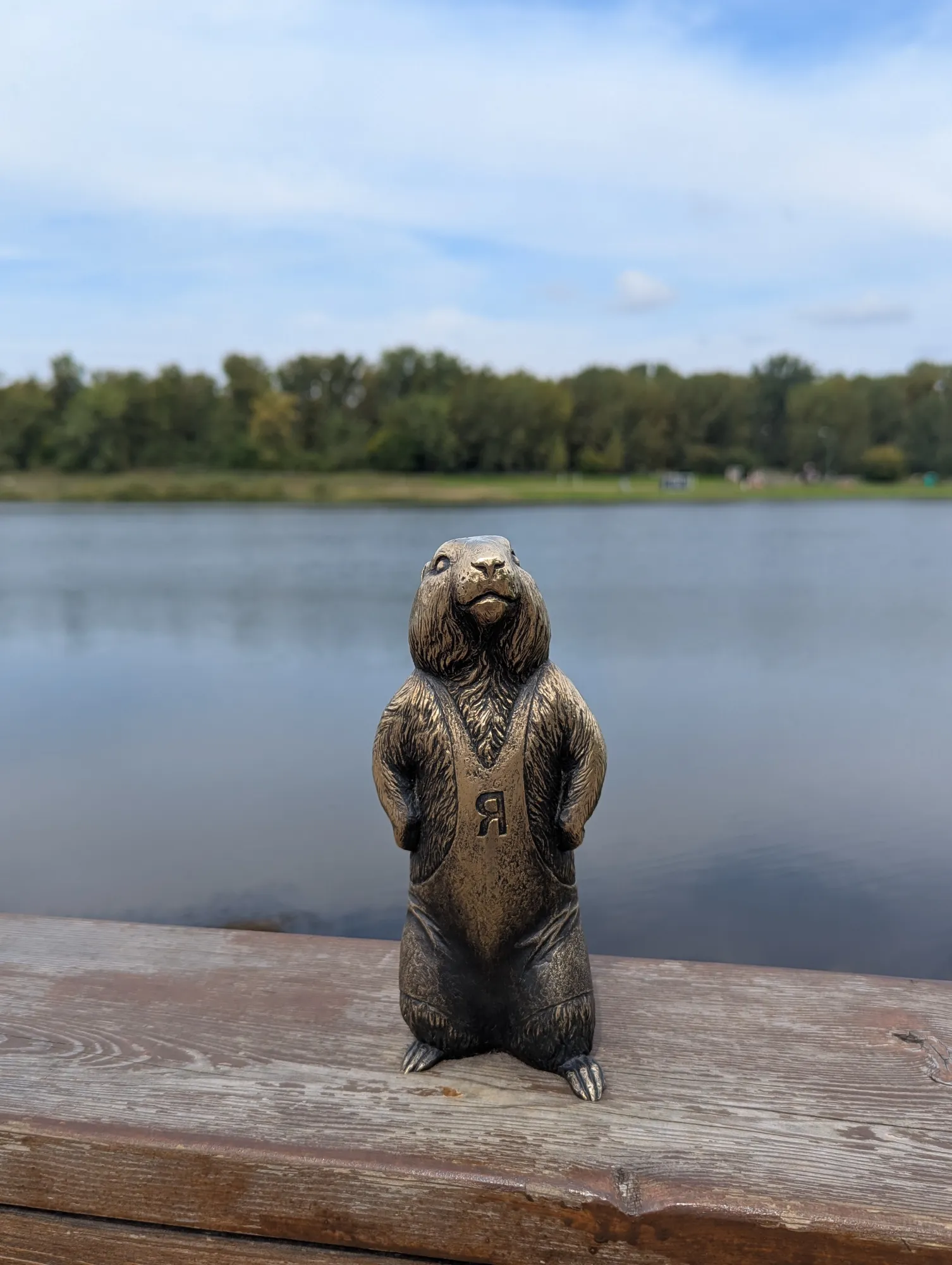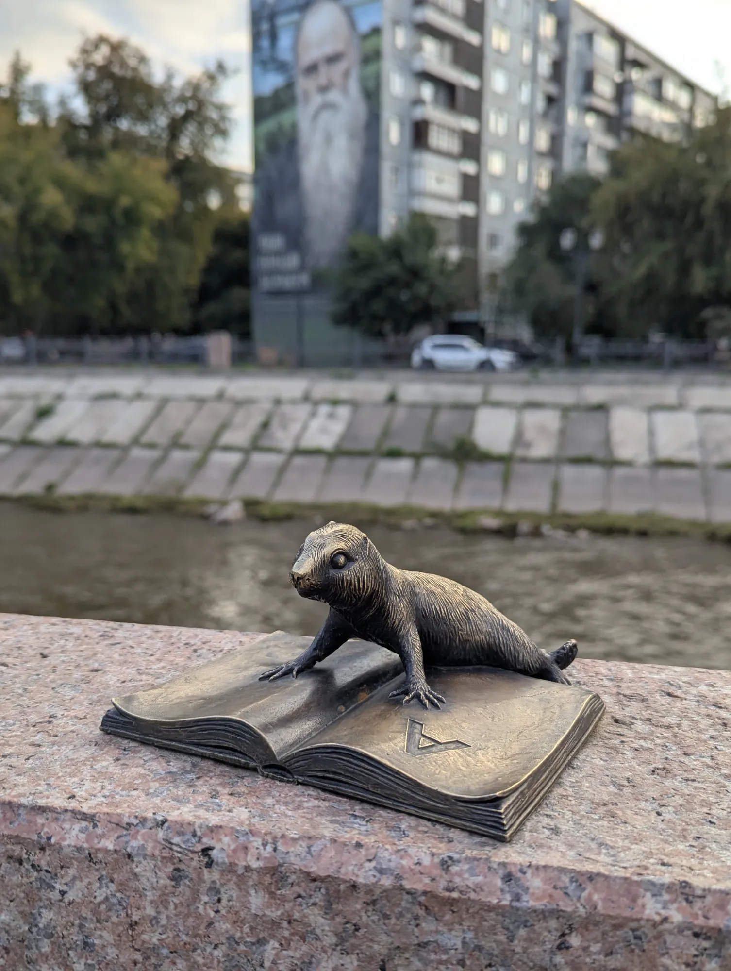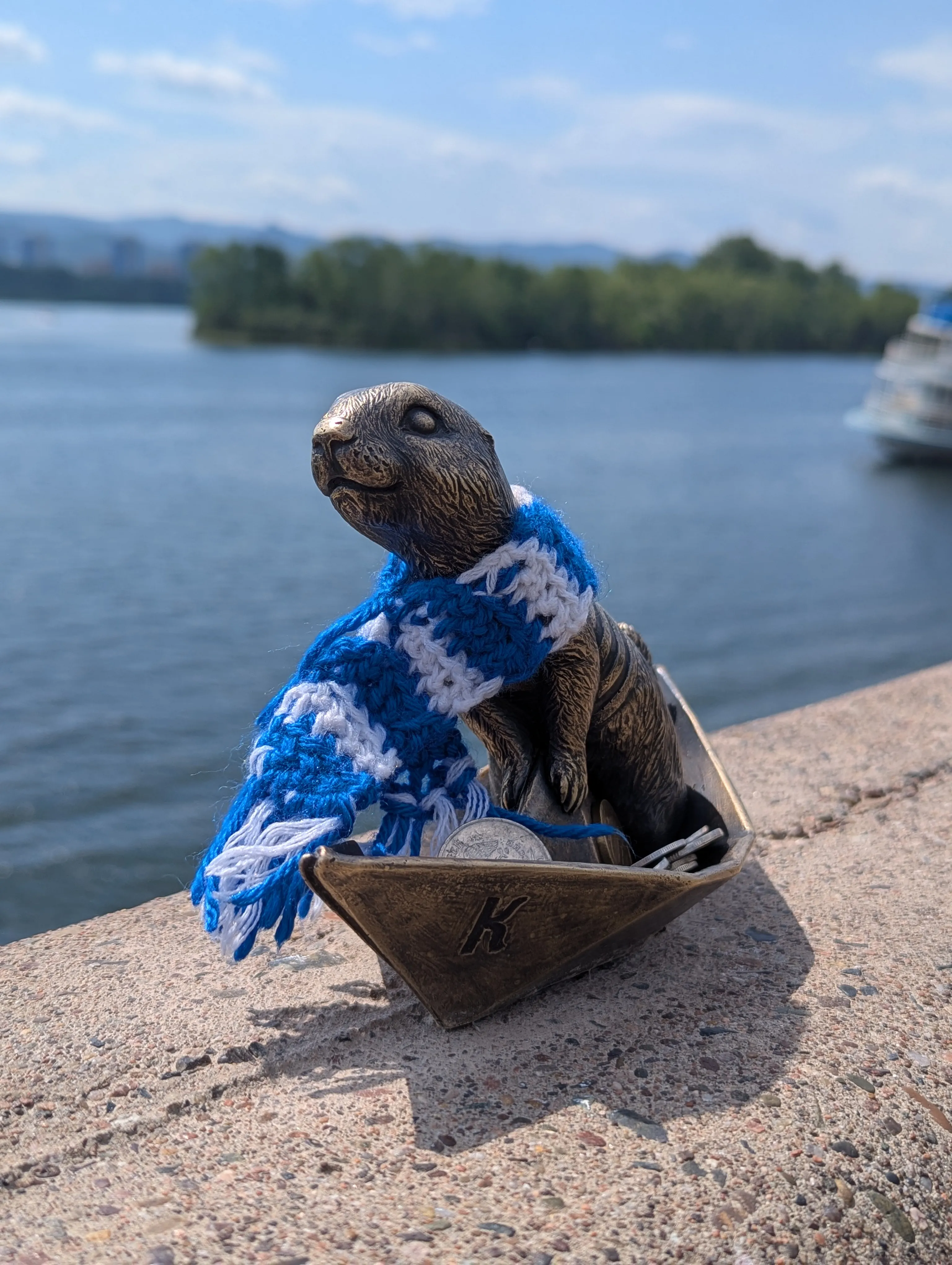 Первого суслика зовут Крас, он речник и находится на центральной набережной справа от Коммунального моста. Со своего кораблика он наблюдает за проплывающими мимо большими речными судами.
