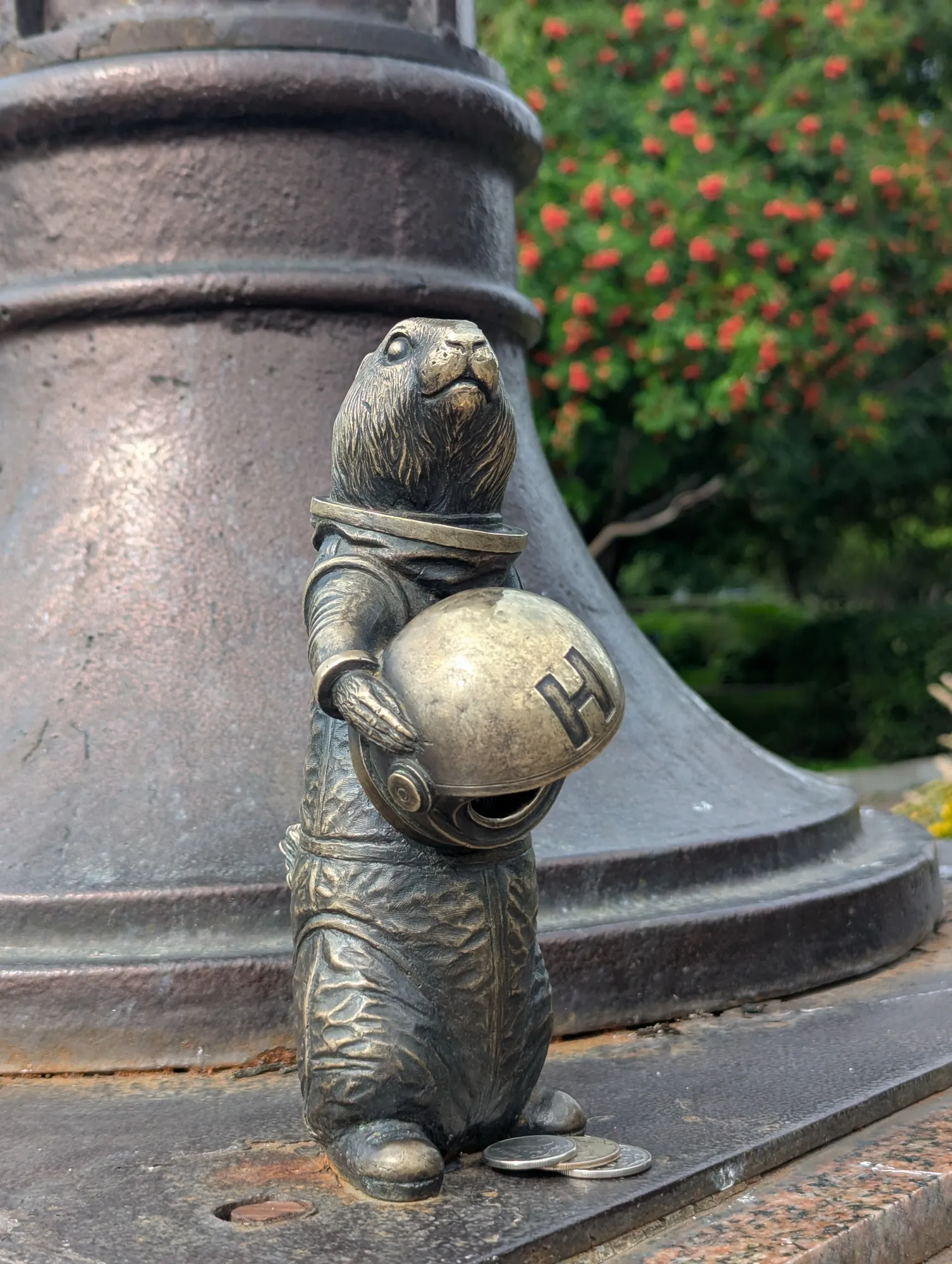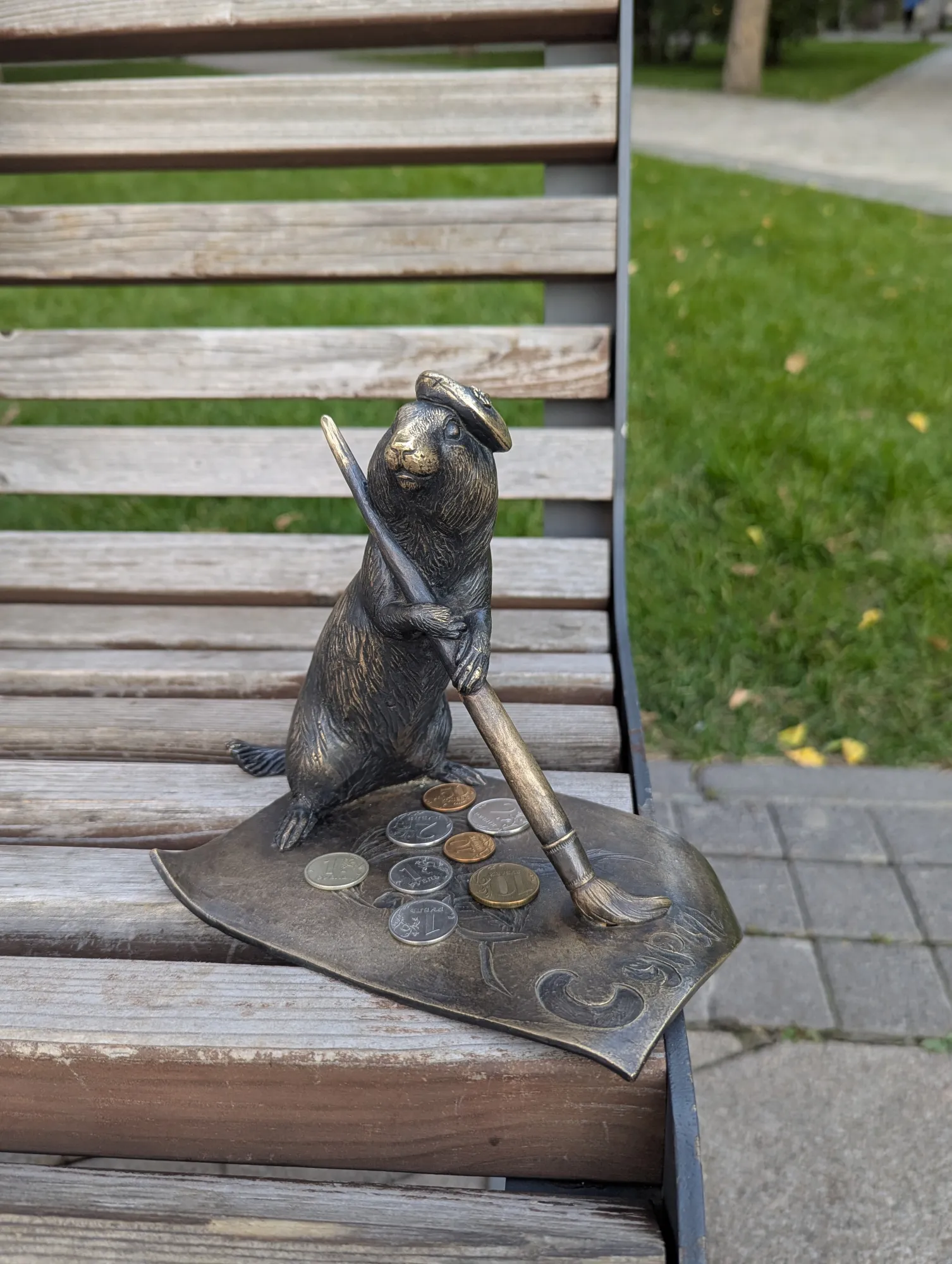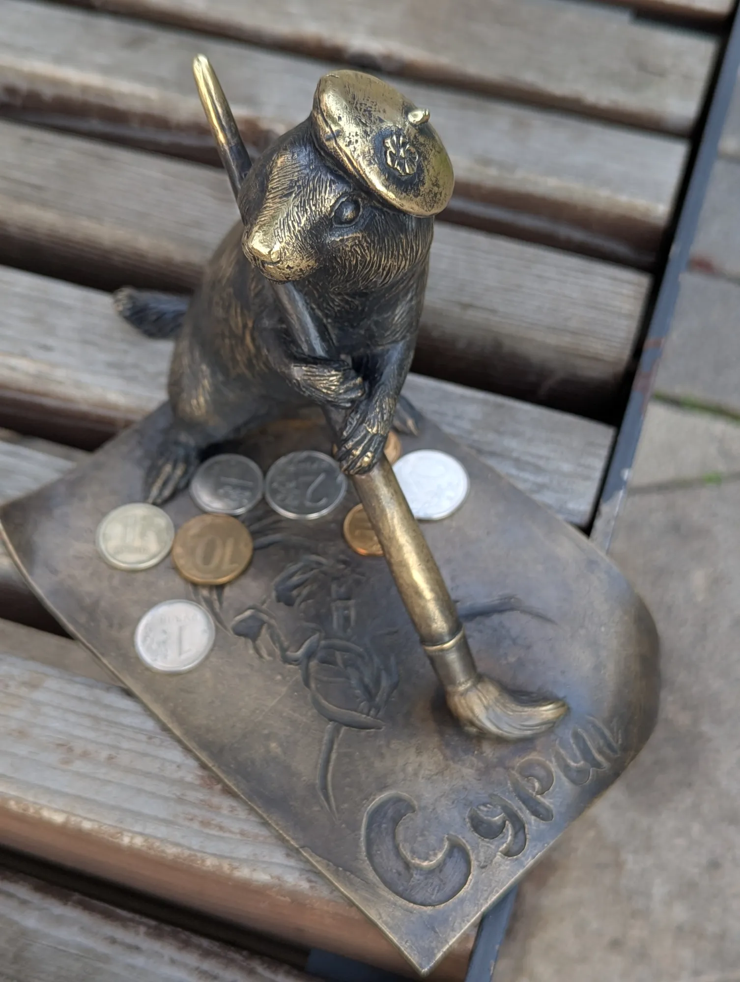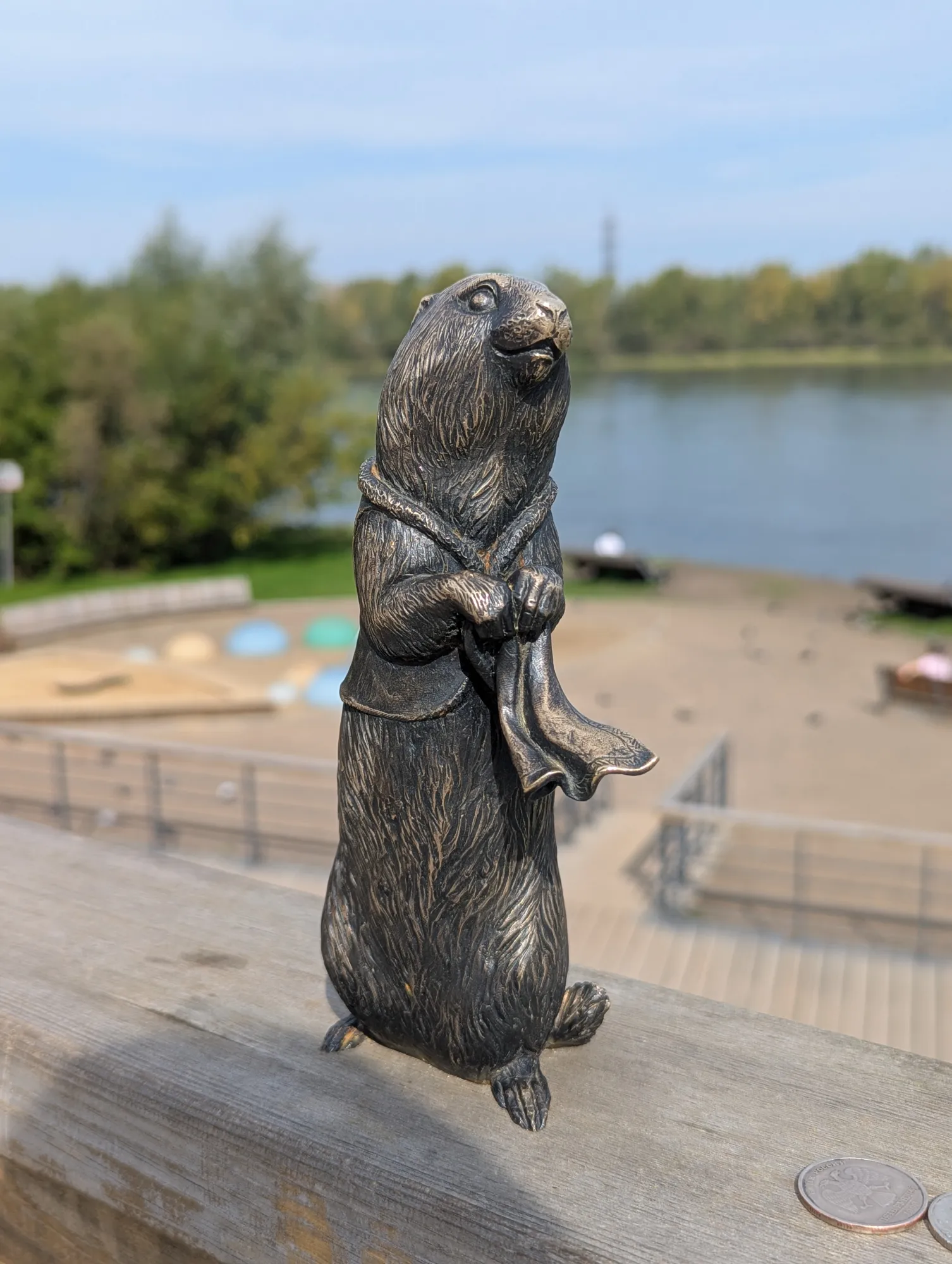 Первого суслика зовут Крас, он речник и находится на центральной набережной справа от Коммунального моста. Со своего кораблика он наблюдает за проплывающими мимо большими речными судами.