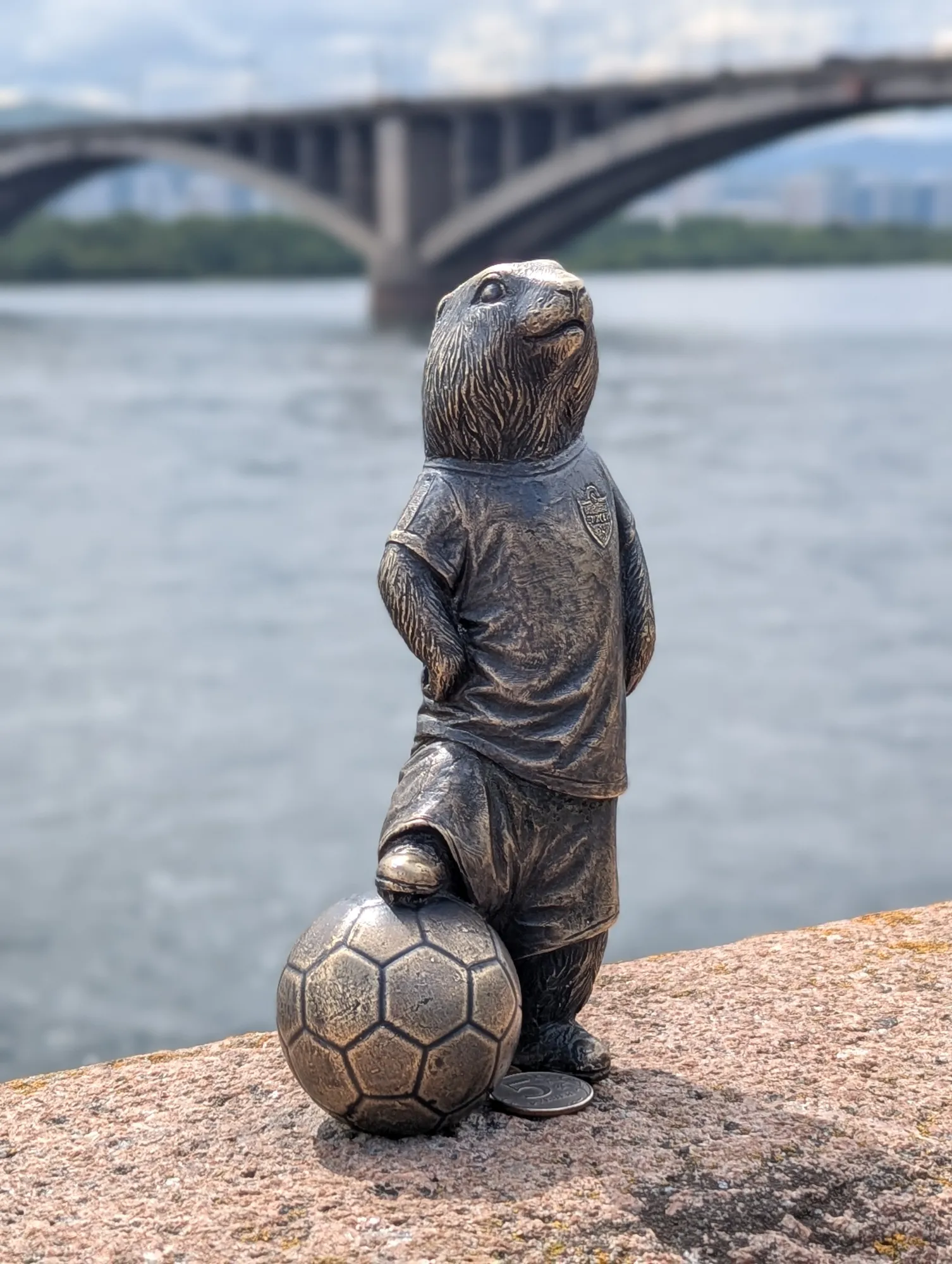 Из первых букв имён сусликов можно составить слово КРАСНОЯРСК. Но кроме них есть ещё один – футбольный клуб Енисей решил внести свой вклад в этот проект и поставил своего суслика, футболиста по имени Финт. Он находится слева от Коммунального моста, совсем недалеко от речника Краса.