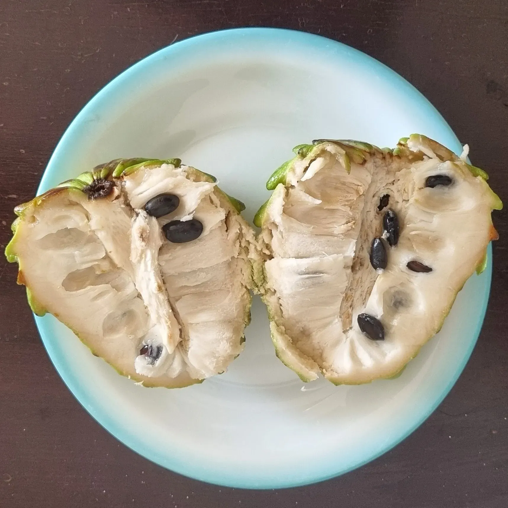 Я так и не смогла разобраться, что это за фрукт такой, потому что гугл объектив его то сметанным обзовёт, то сахарным, то какой-то помесью. Судя по фотографиям - это Атемойя, гибрид сахарного яблока и черимойи (не знаю, что это).