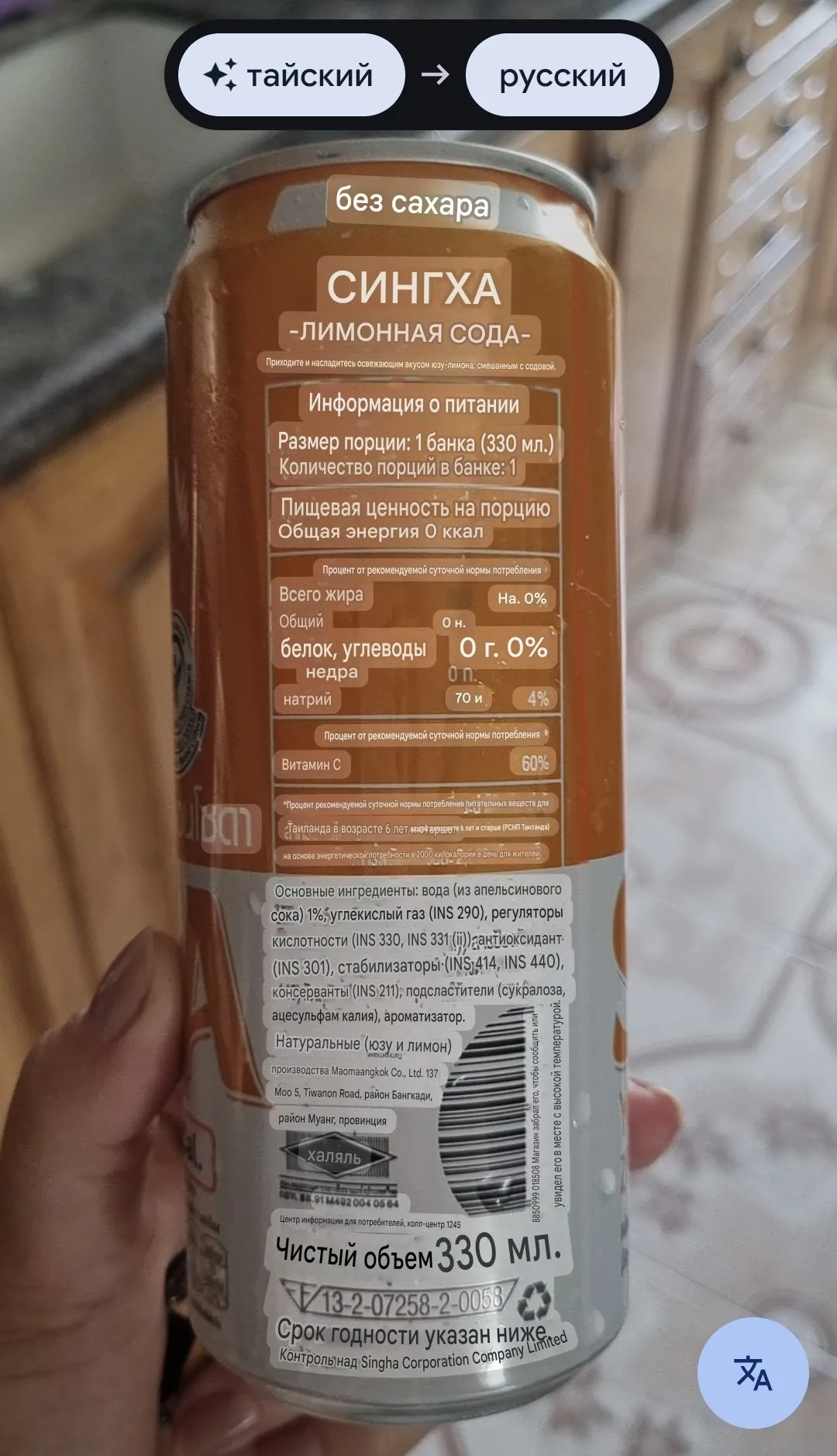 И первый лот у нас - тайская газировка с лимонным вкусом. В составе, правда, если верить гугл переводчику, вода из апельсинового сока, но кто ж их, тайцев-то, поймёт.