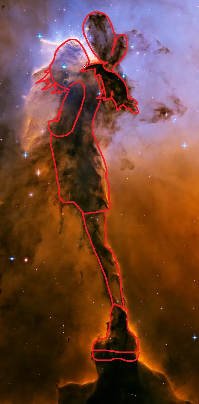 Ирония в том, что тот же самый свет, который разрушает газовые облака, может и запускать рождение новых звёзд — особенно в верхней части башни, где видны яркие уплотнения и светящиеся «пальцы». Там нагретый газ расширяется, как таран, врезаясь в холодные слои и сжимая их — а сжатый газ — идеальная среда для появления звёзд. И этот процесс медленно спускается вниз по башне, как тихая волна творения.