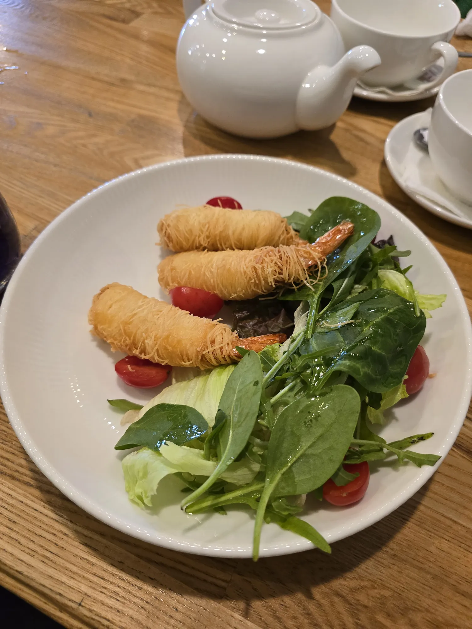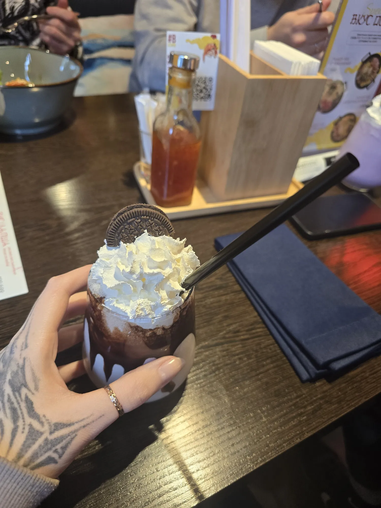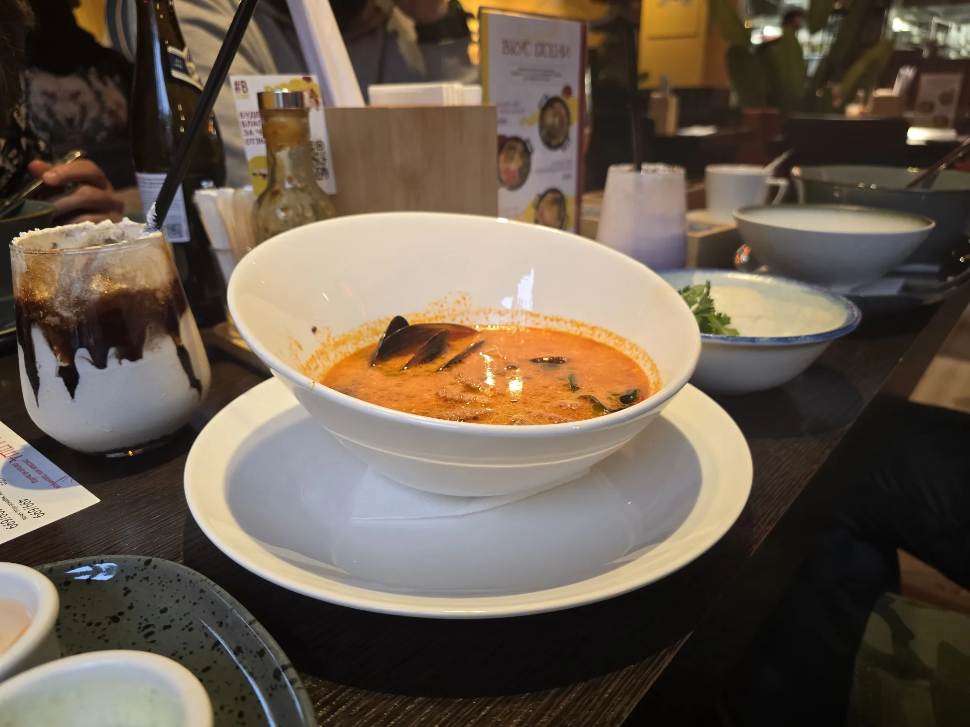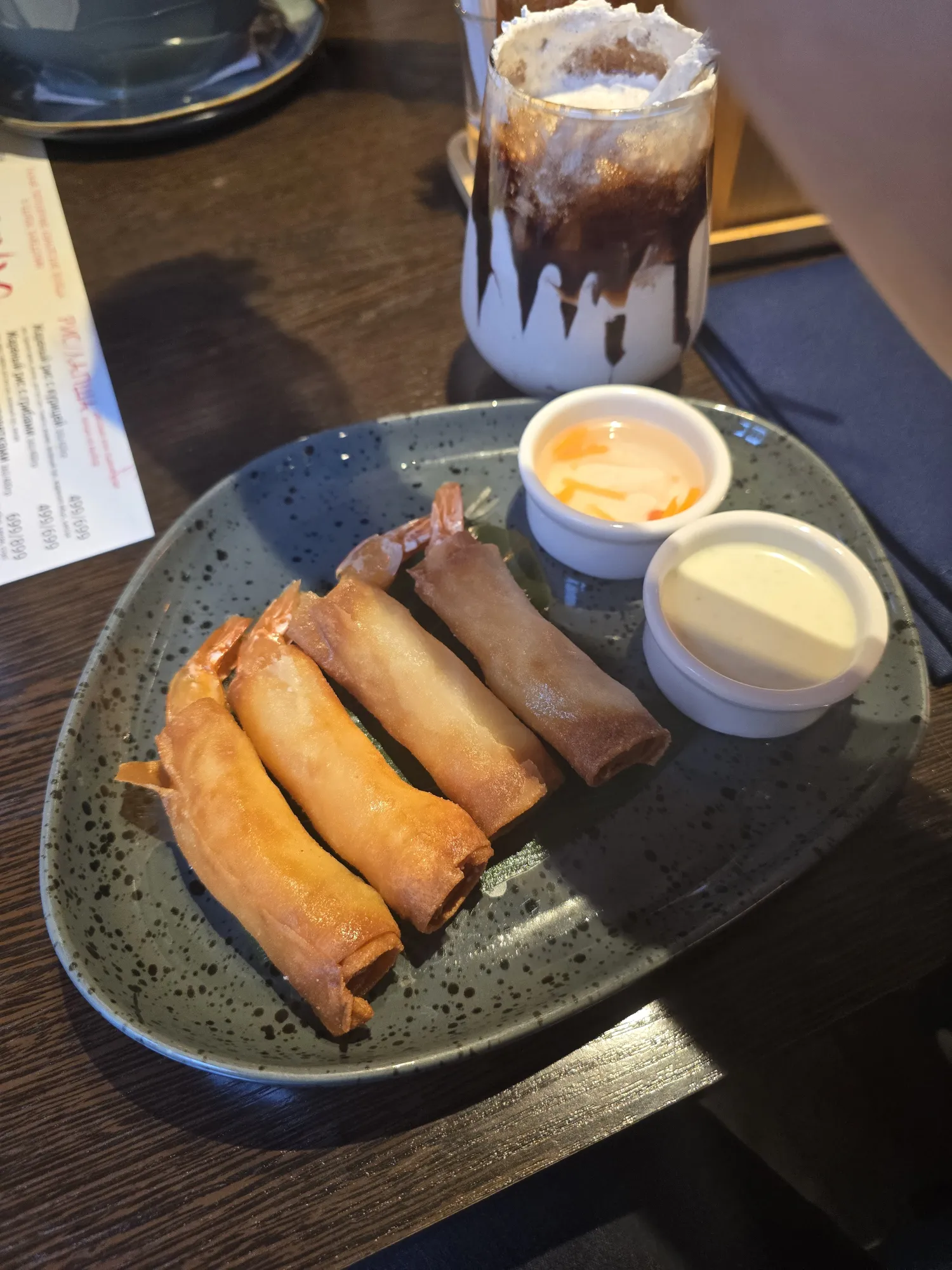 Том-ям с лососем и гребешками (из охуеть какой классной асимметричной тарелки), спринг-роллы типа с креветкой и соусом кинза-сливки и милкшейк орео:)
