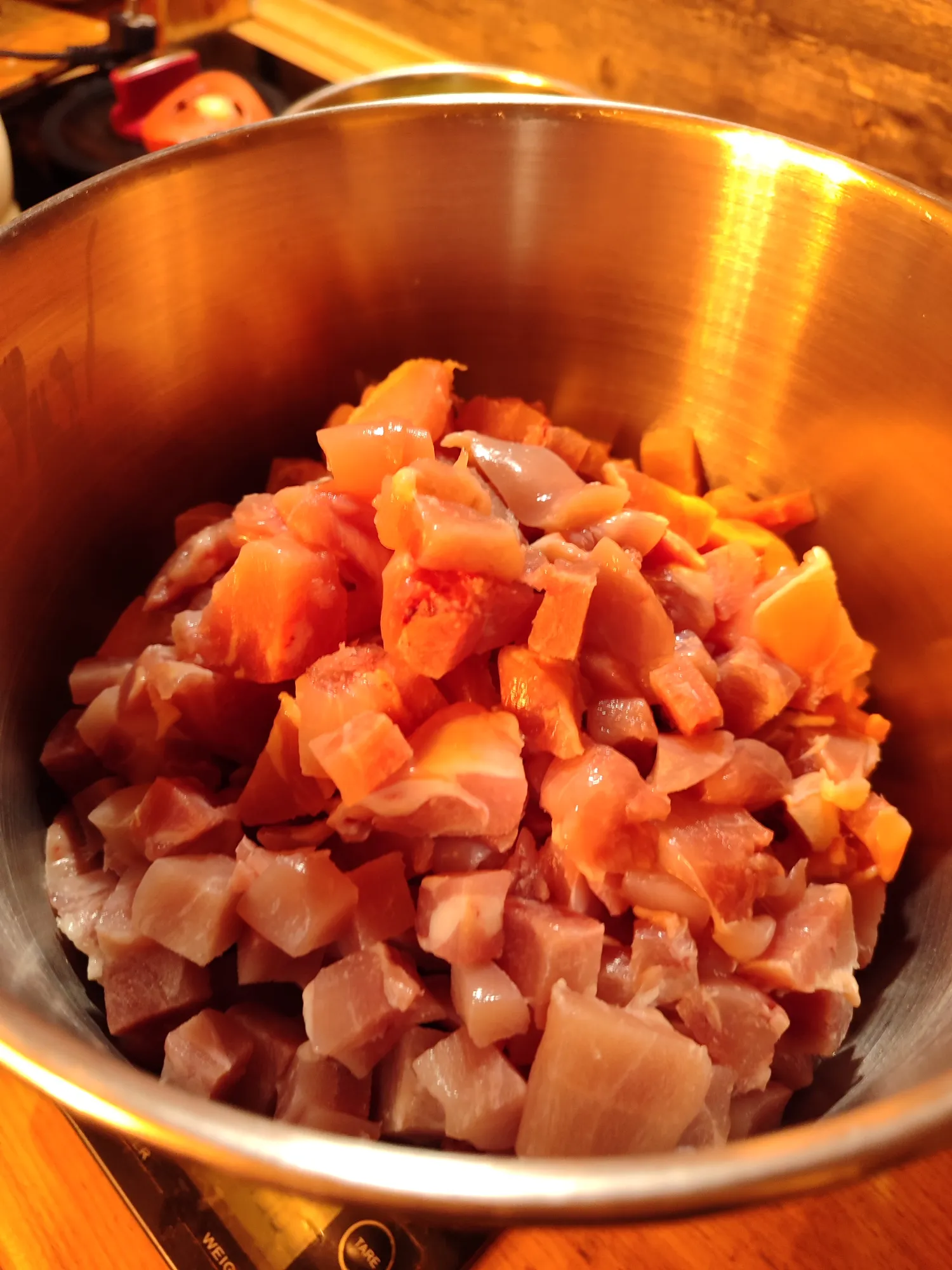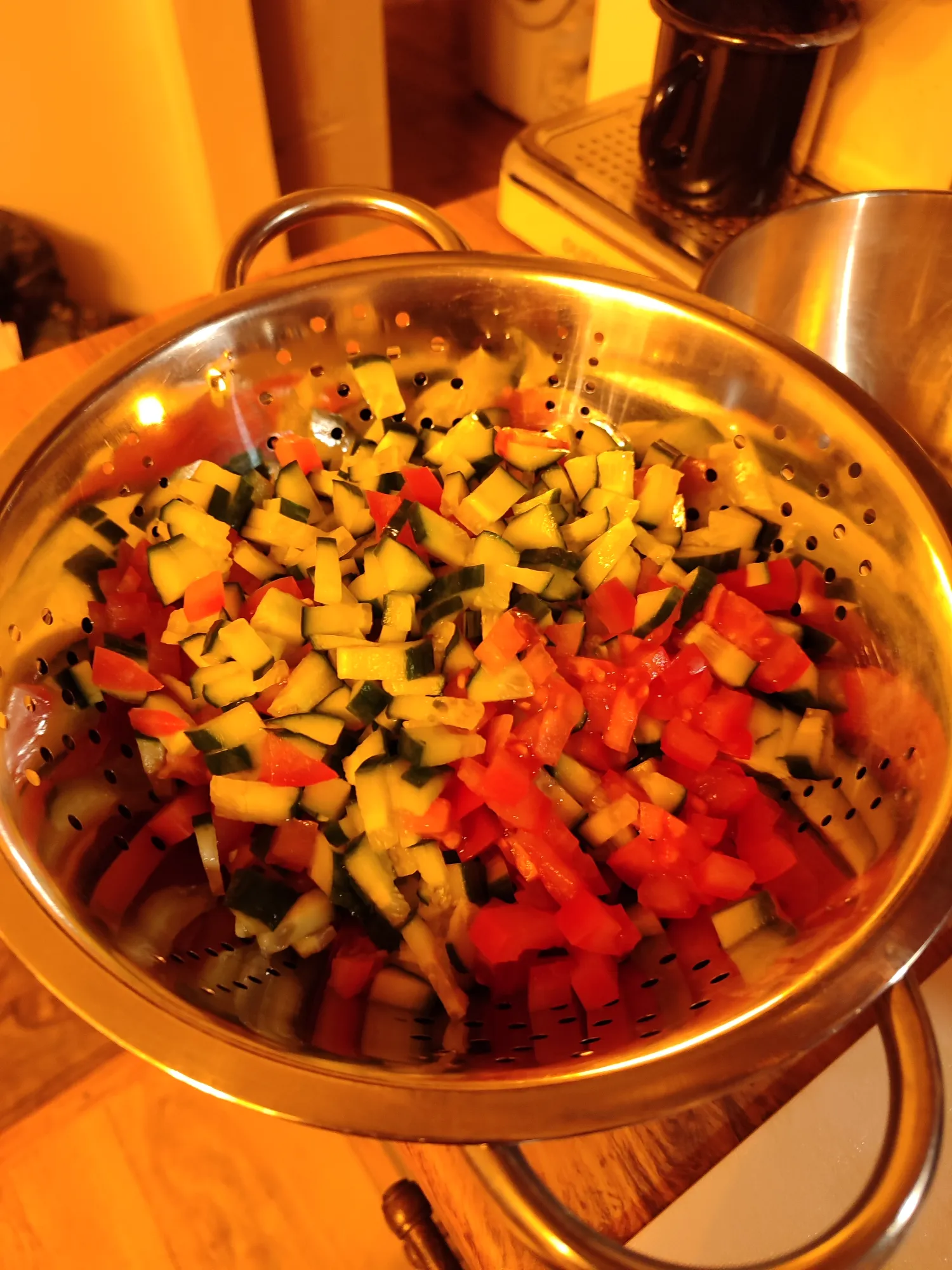 А пока оно тушится, мелкими кубиками нарезаем овощи и складываем в дуршлаг, чтоб стекли лишние соки