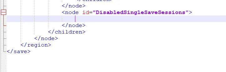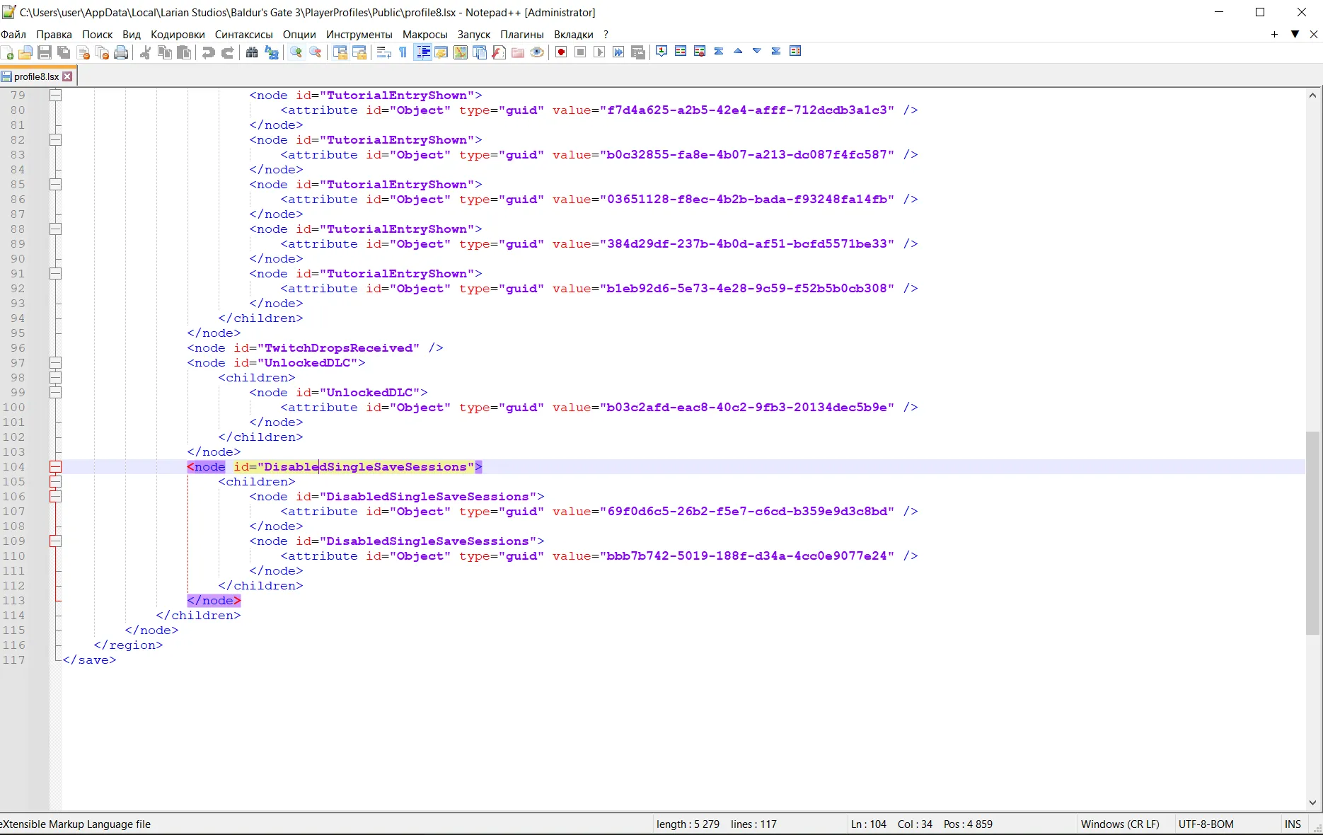 4. Открываем полученный файл "profile8.lsx" с помощью любого текстового редактора и находим строку "DisabledSingleSaveSessions":