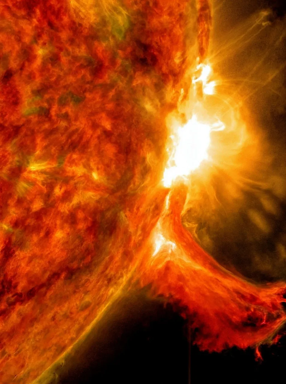 Перед нами — мощная солнечная вспышка и корональный выброс массы, зафиксированные аппаратом Solar Dynamics Observatory.
