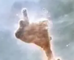 А вверху кадра — необычная туманность, похожая на тот самый палец. Эта причудливая структура — ещё один фрагмент бурного региона, где мощное излучение молодых и горячих звёзд непрерывно лепит из межзвёздного газа причудливые формы.