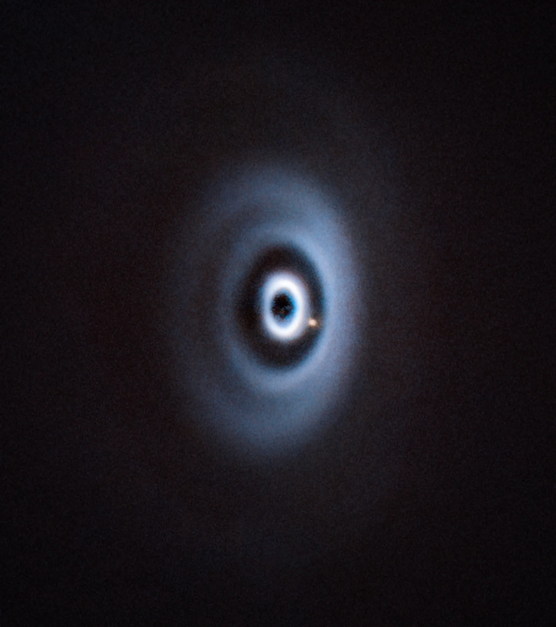 На этом снимке запечатлён протопланетный диск молодой звезды, подобной Солнцу. В его структуре уже заметны перепады плотности вещества. Особенно выделяется яркая точка в разрыве между первым и вторым кольцами — это формирующаяся протопланета WISPIT 2b, хорошо различимая на изображении, полученном телескопом VLT. Данный газовый гигант примерно в пять раз массивнее Юпитера и обращается вокруг своей звезды на расстоянии, в три раза превышающем дистанцию от Юпитера до Солнца.