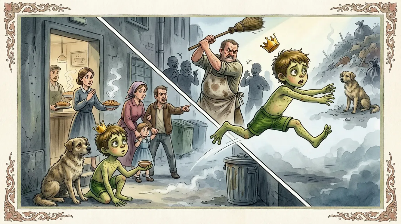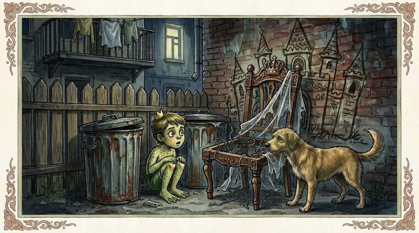— Знаешь, зелёный, — нарушил тишину пёс. — Ты это... того... больно приметный. Корона, морда лягушачья, лапы перепончатые. Люди такого не любят. Надо тебя приодеть, чтоб не так в глаза бросался.