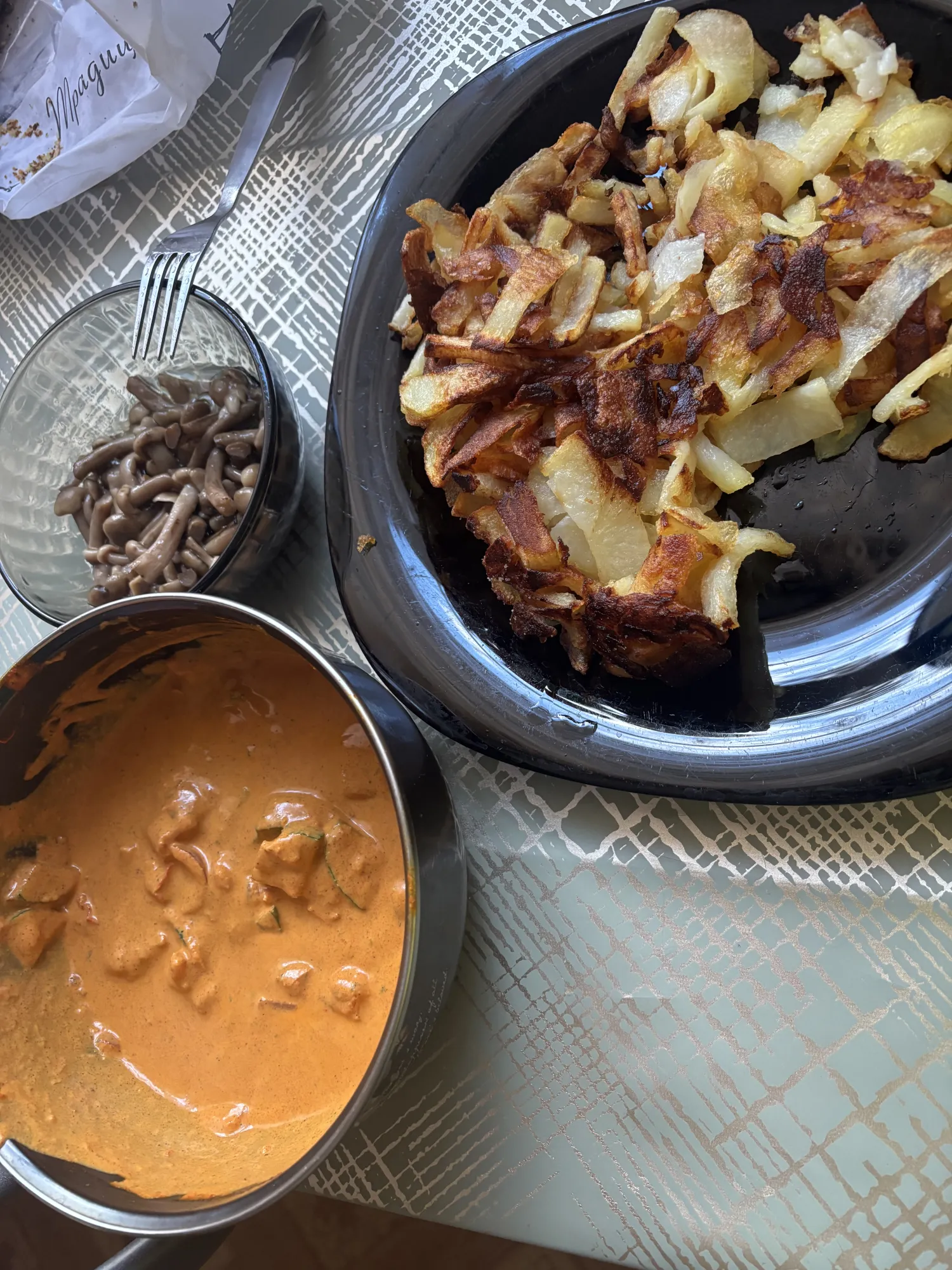 потому что я жареную хочу прям со шкуркой: совсем мелкую картошку (типа как севок размером) помыть с железной щеткой, чуть обсушить и на сковородку. жарить без крышки и соли на среднем огне. мешать периодически-чем чаще, тем меньше горелок (а они вкусные, но тут баланс нужен). когда готово-добавить чуток масла сливочного и посолить. мне заходит крупная соль. вкуснее ток в духовке в мундирах запечь (обычного размера), оставить на второй день. вот тут достаем из холодоса, давим толкушкой, добавляем молока, слив. масла и соли. разжариваем на сковородке как хотим-мне вкуснее с поджаристой корочкой. идеально это все с жареной квашеной капустой.