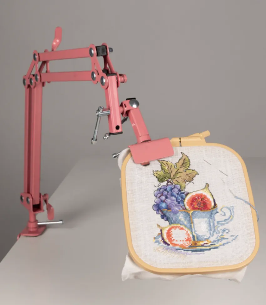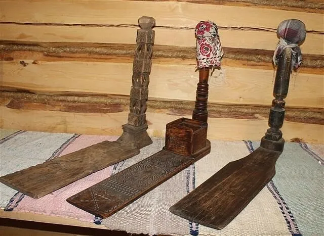 В наших деревнях схожее приспособление было, но более прялкоподобное: на ноге сидишь, сверху к мягкому навершию прикалывалась ткань.