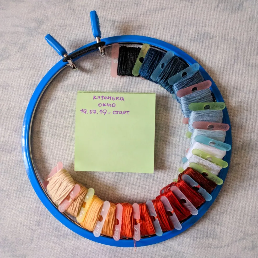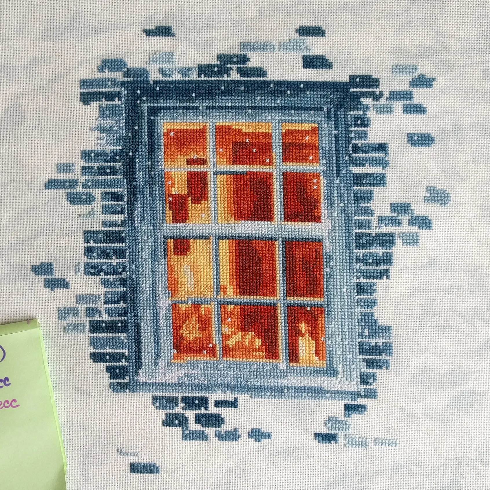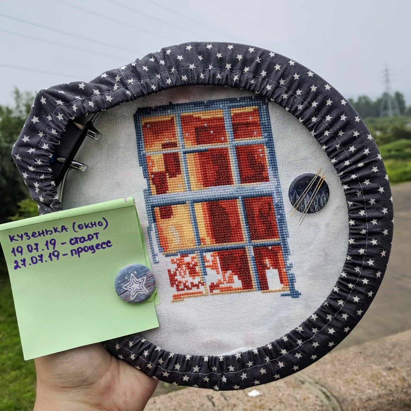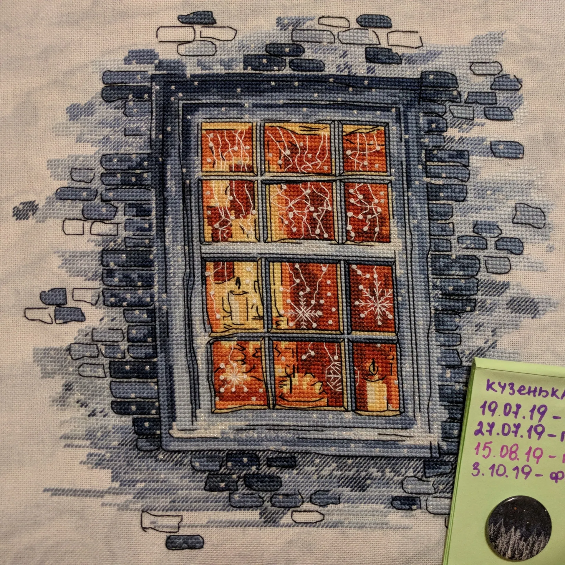 Процесс оказался очень лёгким: схема логичная, без одиночных крестиков и прочих «радостей». В день, когда была сделана фотография ниже, я сходила на свою первую встречу вышивальщиц... А затем сломала ногу :)