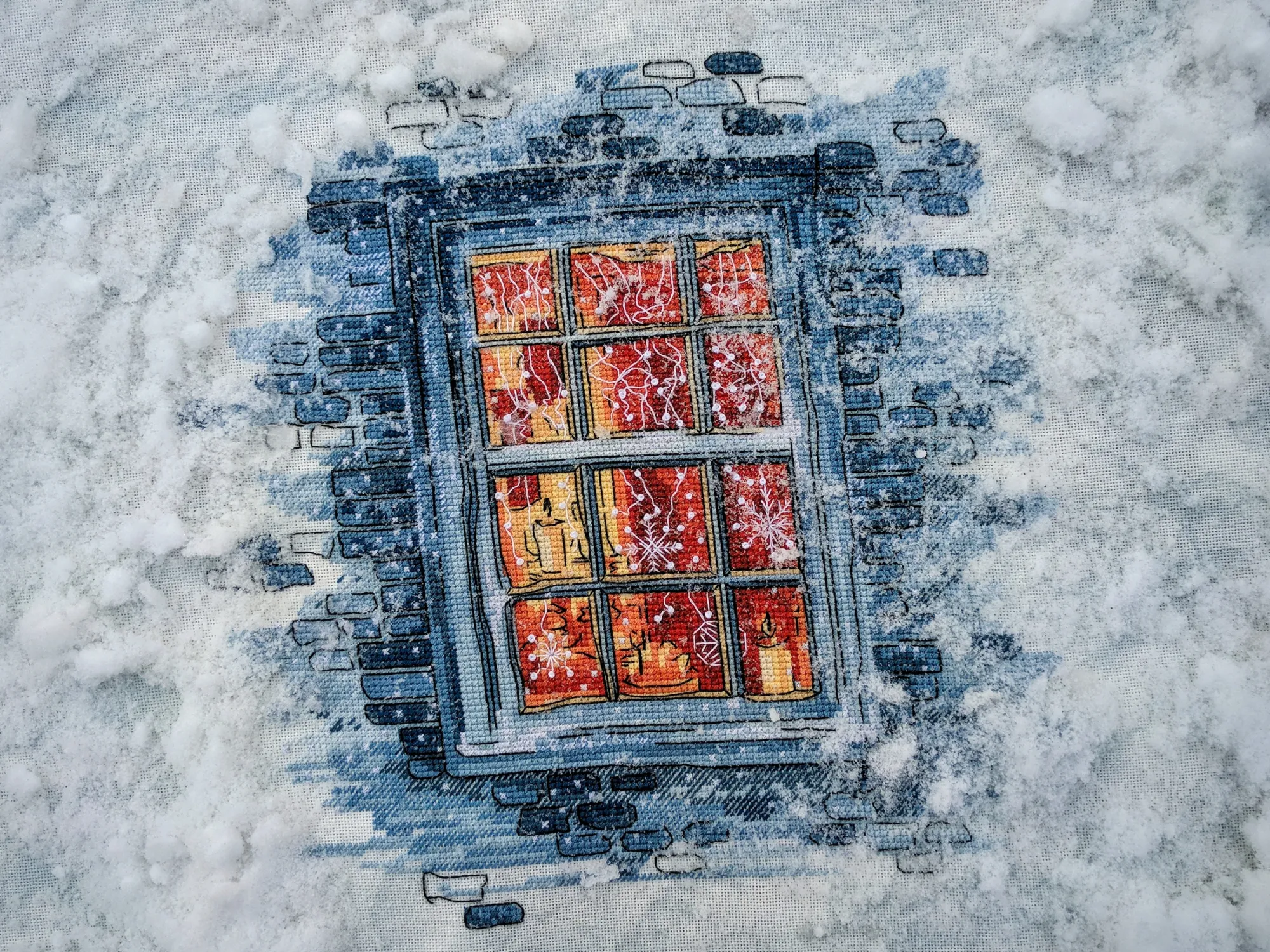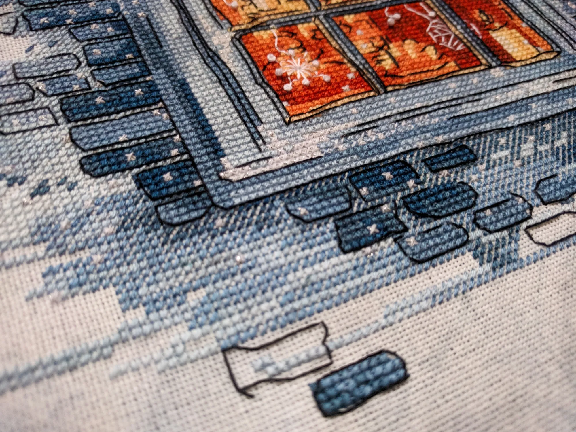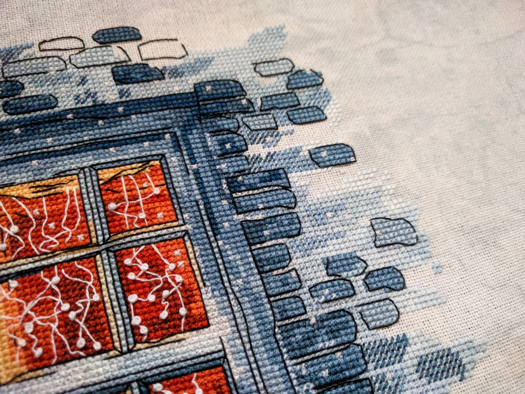 Белые нитки я заменила на такие же белые, но с добавлением люрекса. На фотографиях этого почти не видно, но вживую работа приобрела лёгкий снежный блеск.