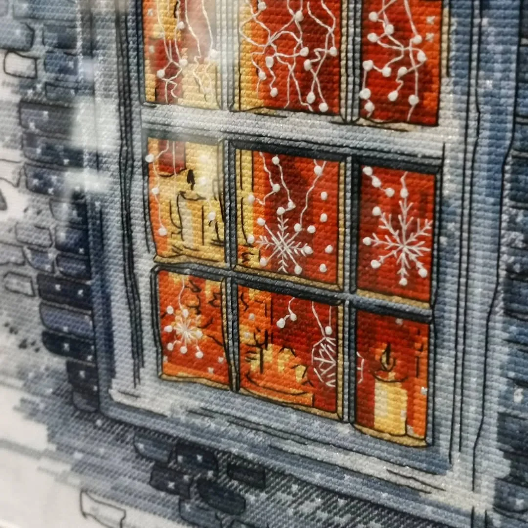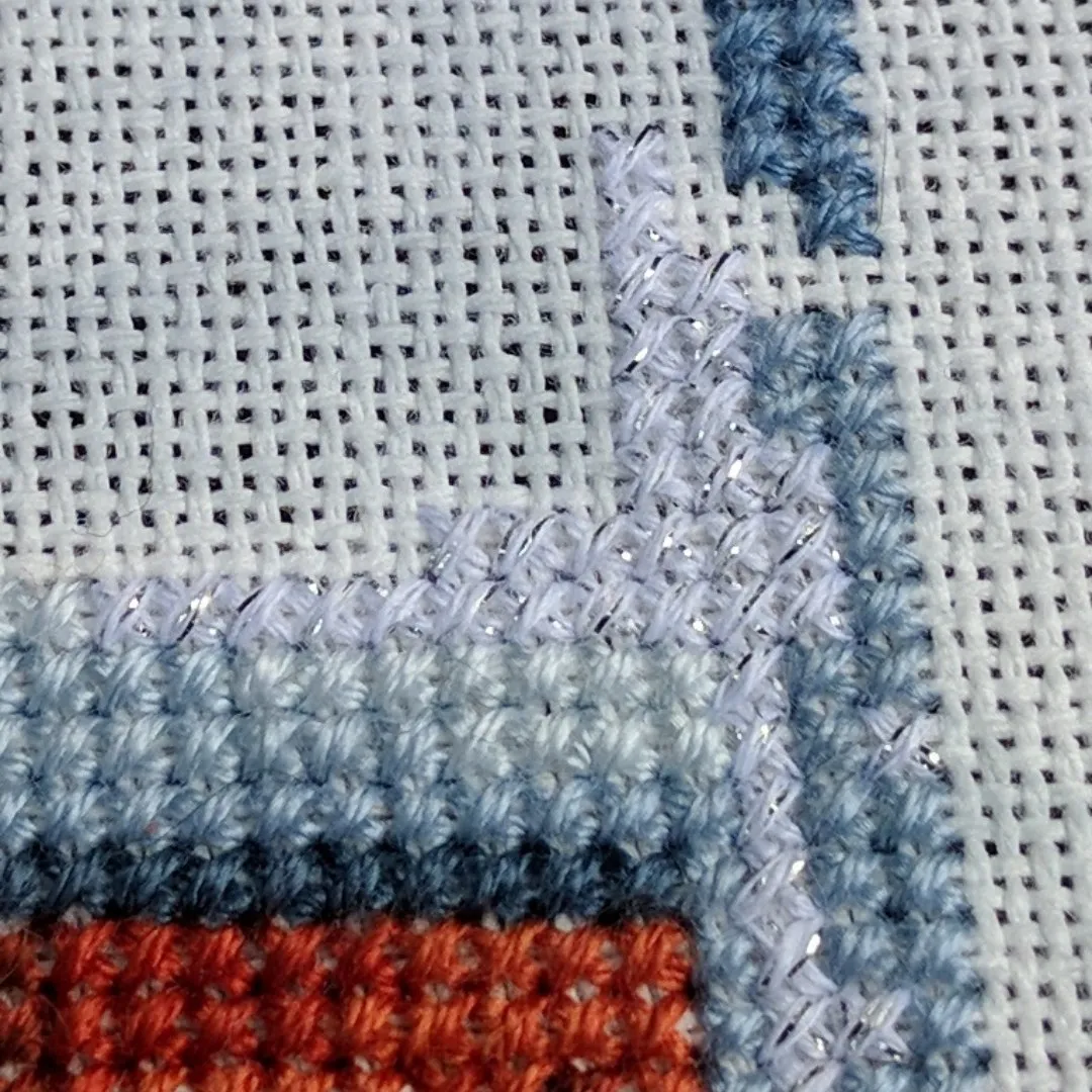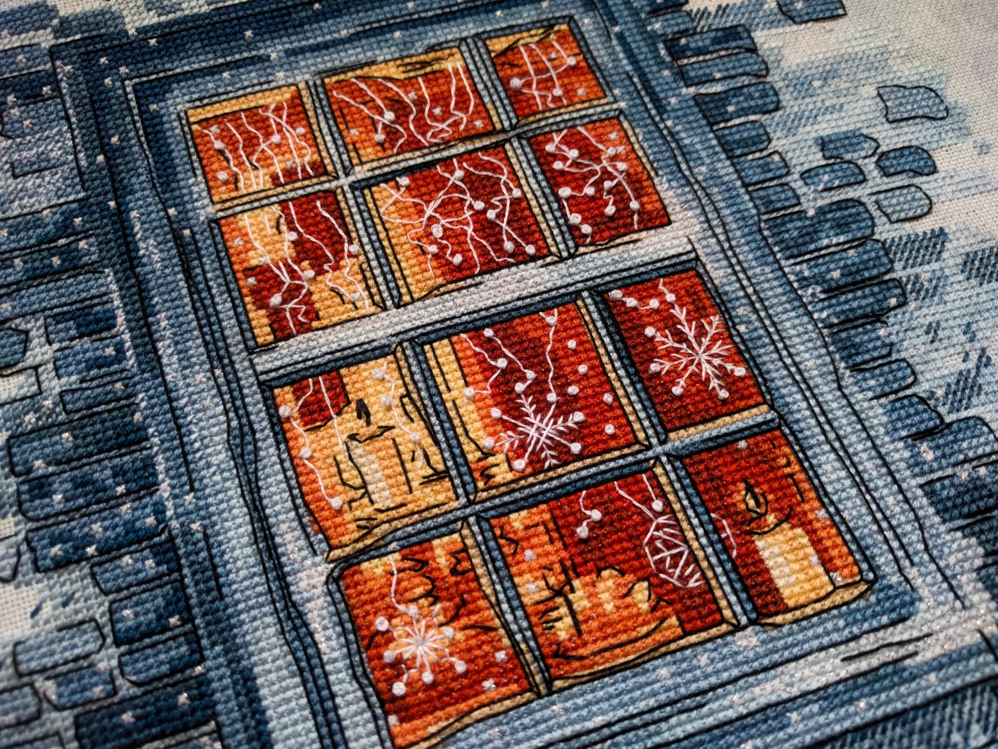 Белые нитки я заменила на такие же белые, но с добавлением люрекса. На фотографиях этого почти не видно, но вживую работа приобрела лёгкий снежный блеск.