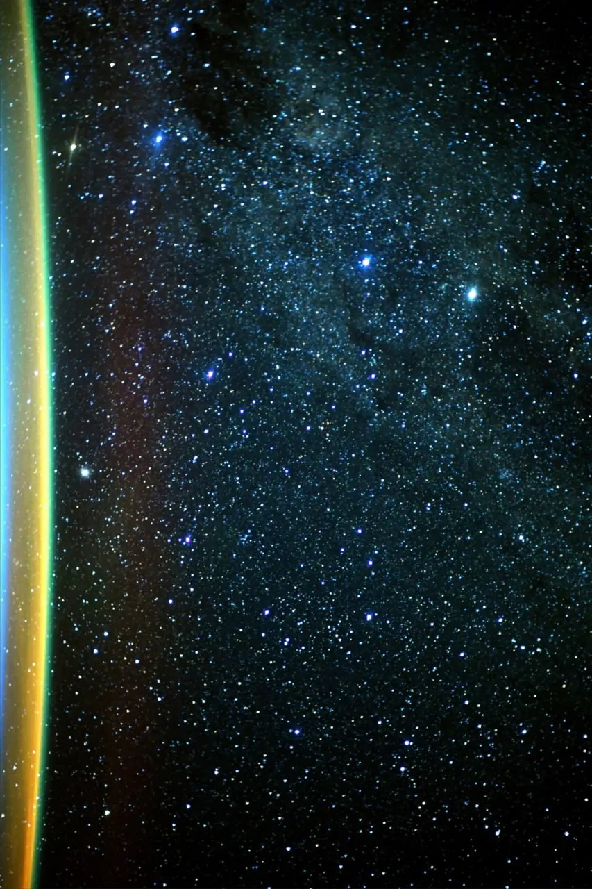 Звёздное небо и сияние атмосферы Земли, запечатлённые с борта МКС.