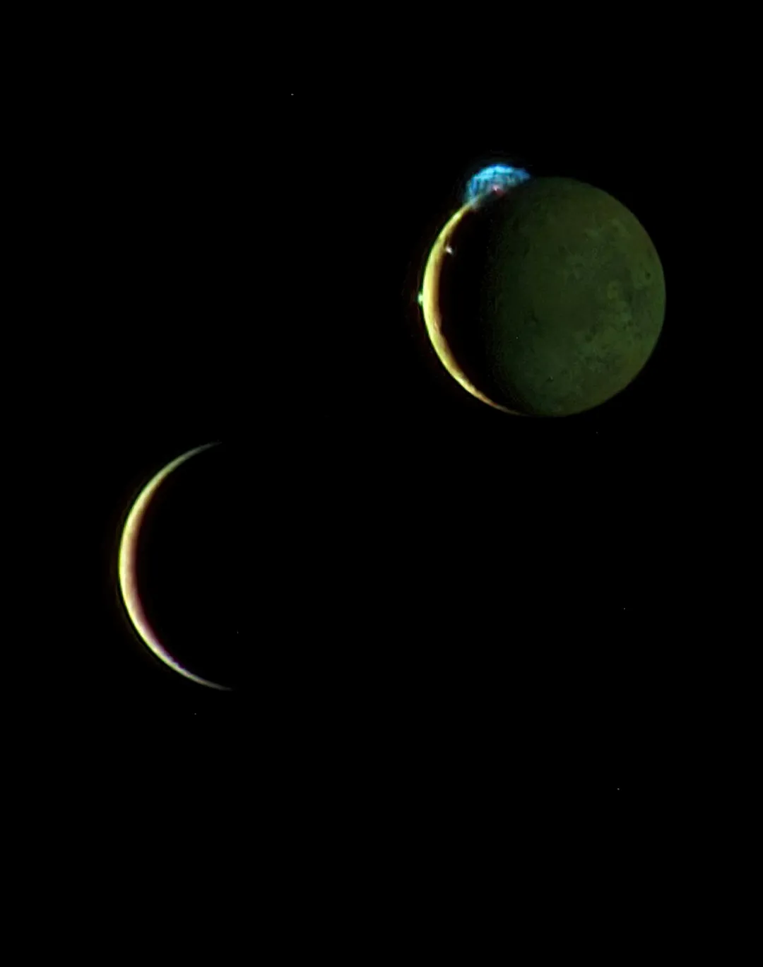 Космический аппарат «New Horizons» 2 марта 2007 года запечатлел бурное извержение вулкана на спутнике Юпитера Ио и спокойный полумесяц его соседки Европы на переднем плане.