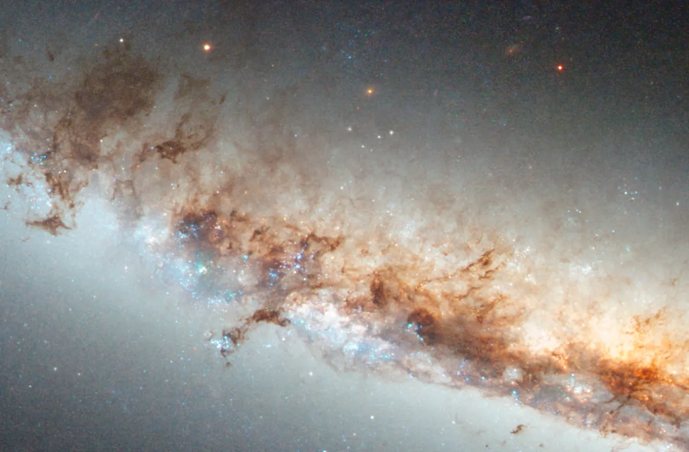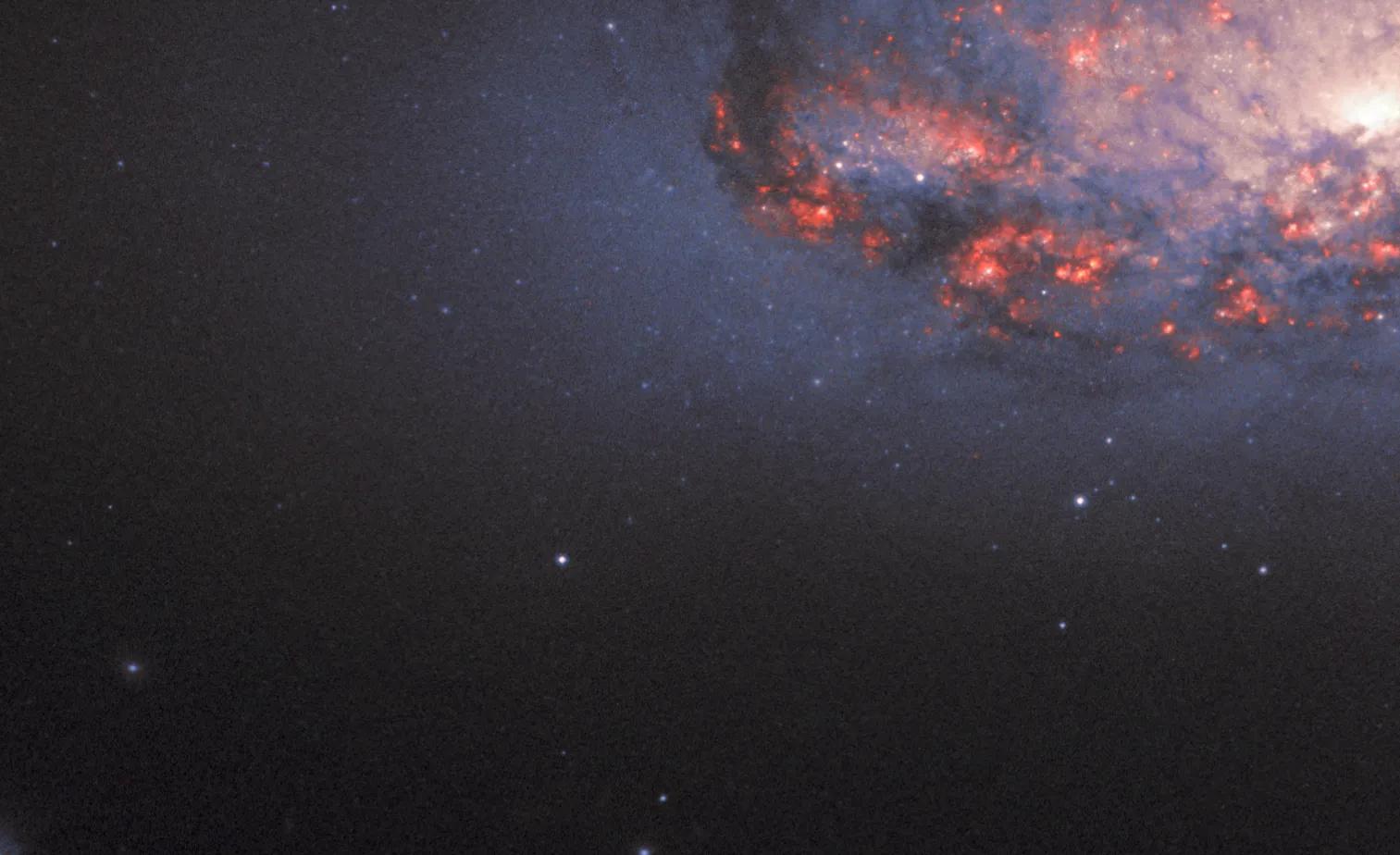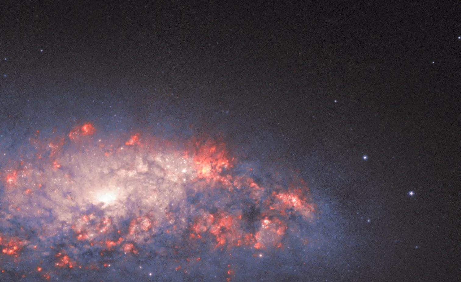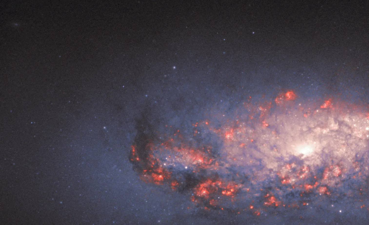 Оранжево-розовое свечение возникает, когда водородный газ взаимодействует с интенсивным светом, исходящим от недавно рождённых звёзд. Такие яркие пятна видны на фоне тёмных, запутанных потоков космической пыли.