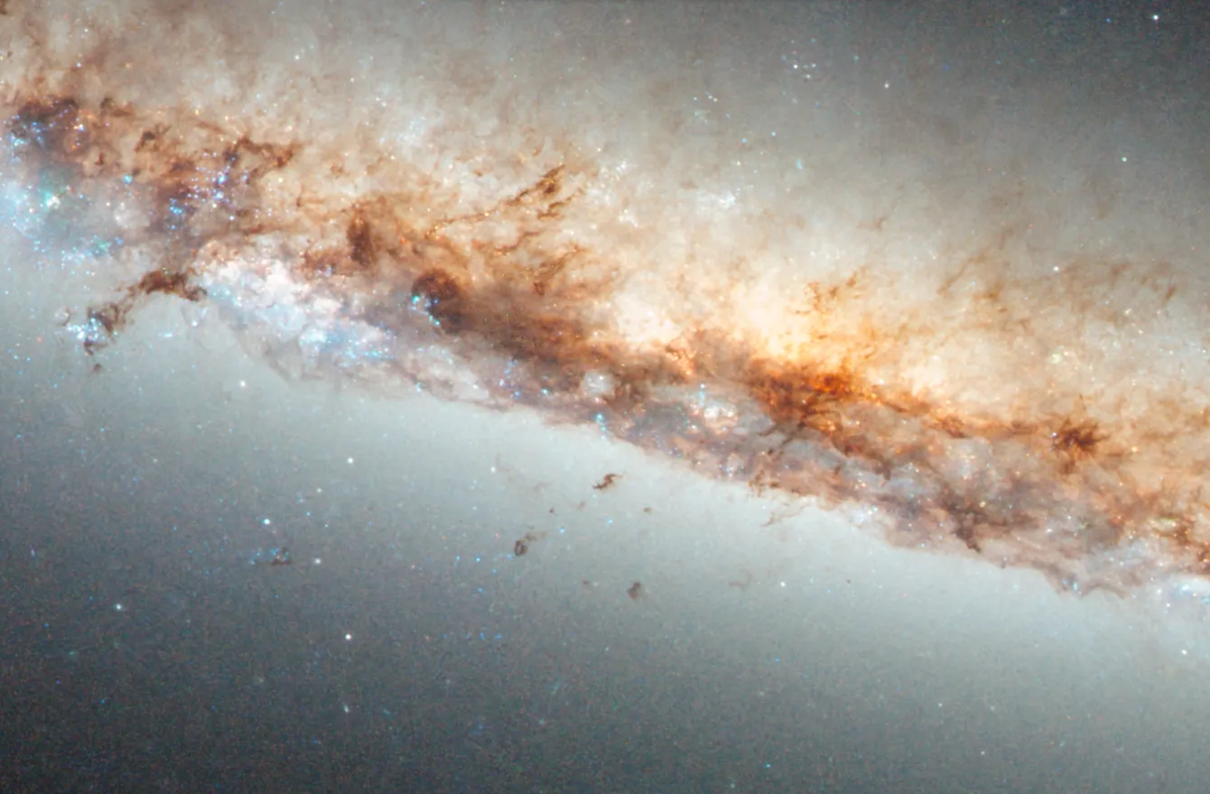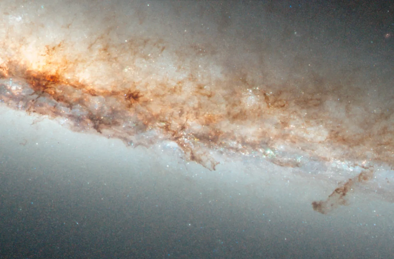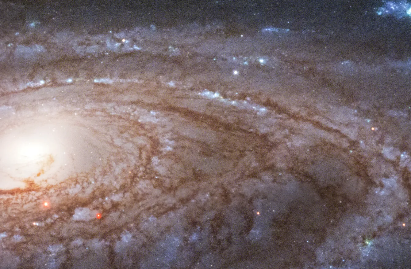 Оранжево-розовое свечение возникает, когда водородный газ взаимодействует с интенсивным светом, исходящим от недавно рождённых звёзд. Такие яркие пятна видны на фоне тёмных, запутанных потоков космической пыли.