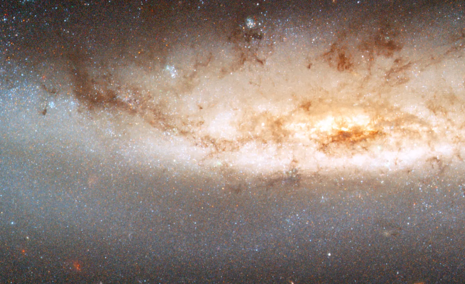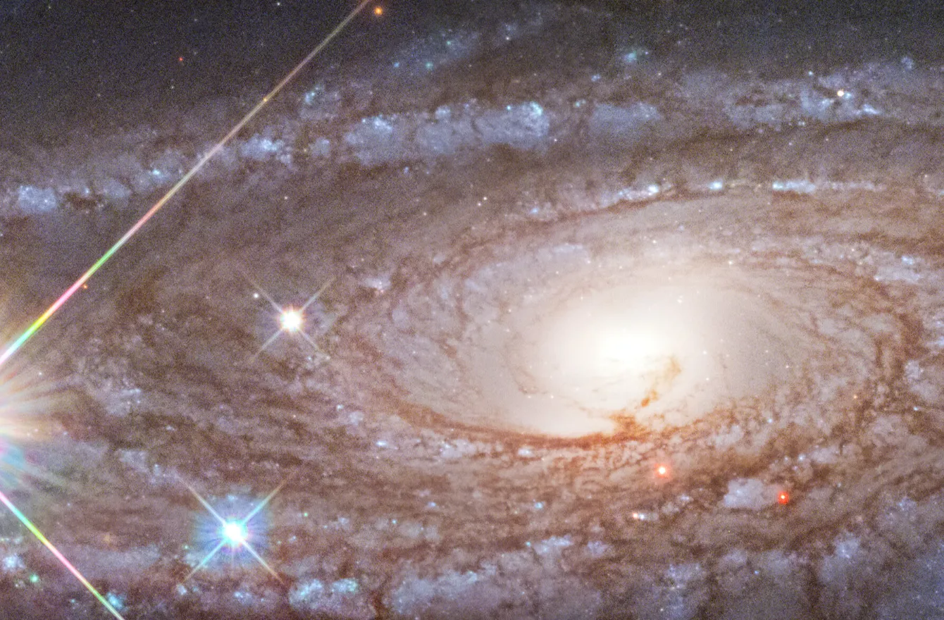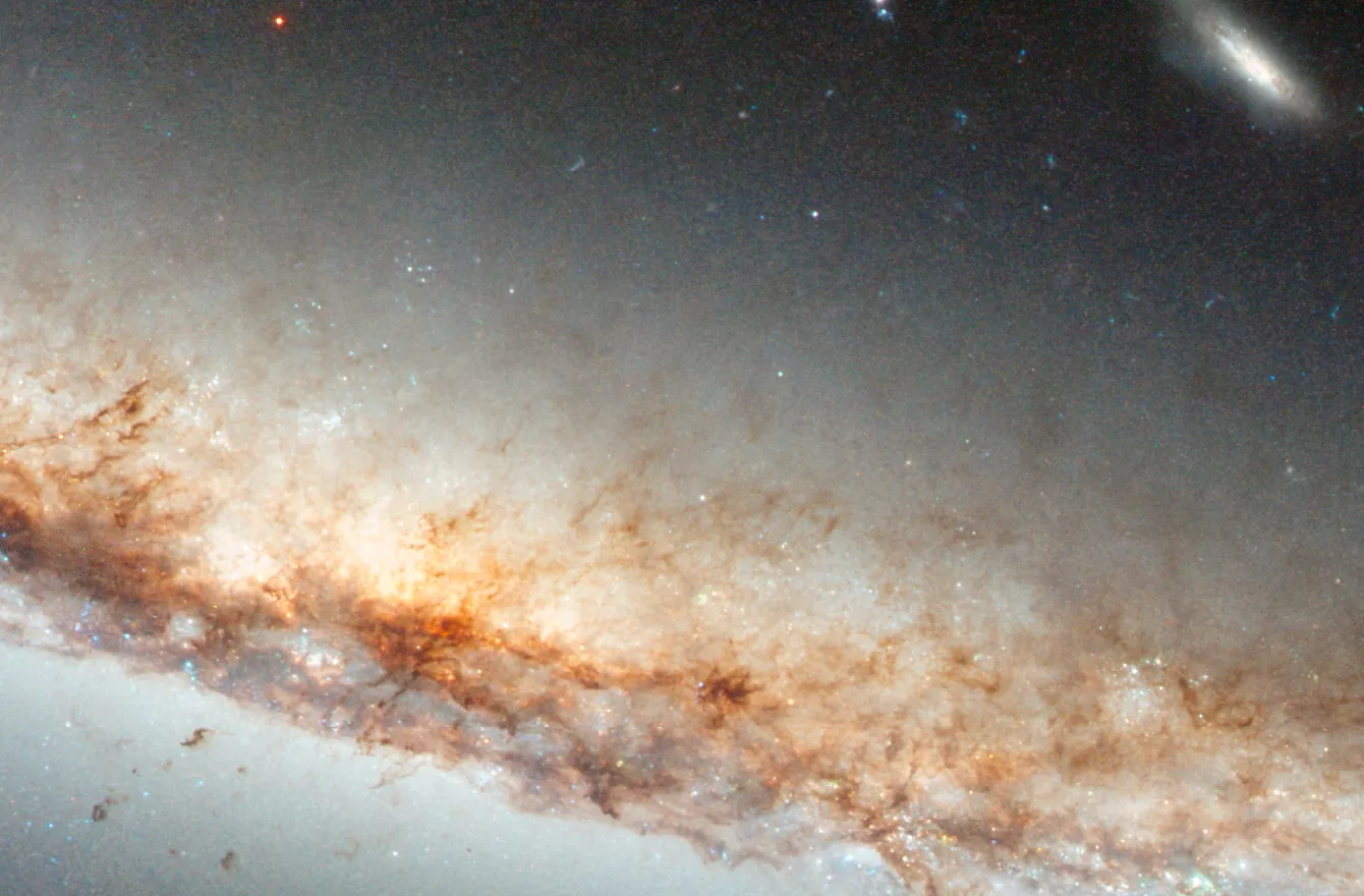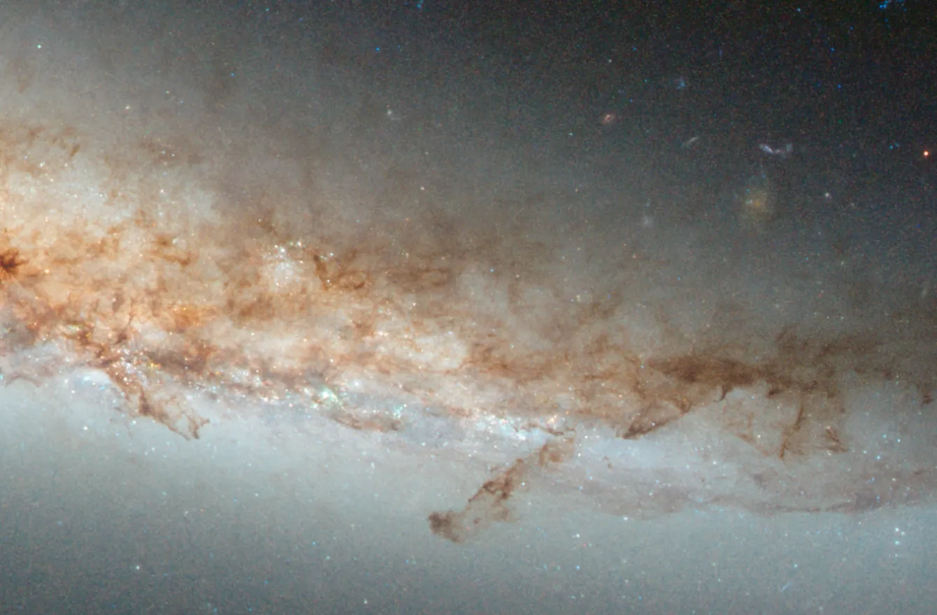 Оранжево-розовое свечение возникает, когда водородный газ взаимодействует с интенсивным светом, исходящим от недавно рождённых звёзд. Такие яркие пятна видны на фоне тёмных, запутанных потоков космической пыли.