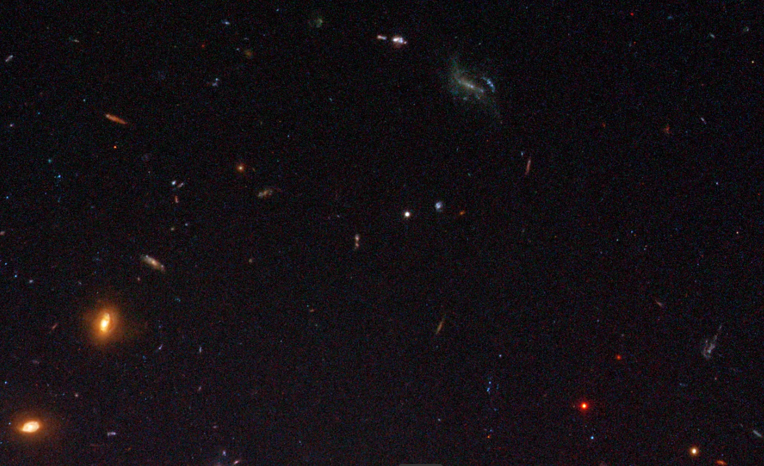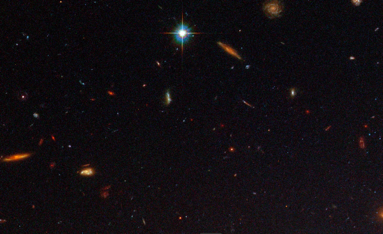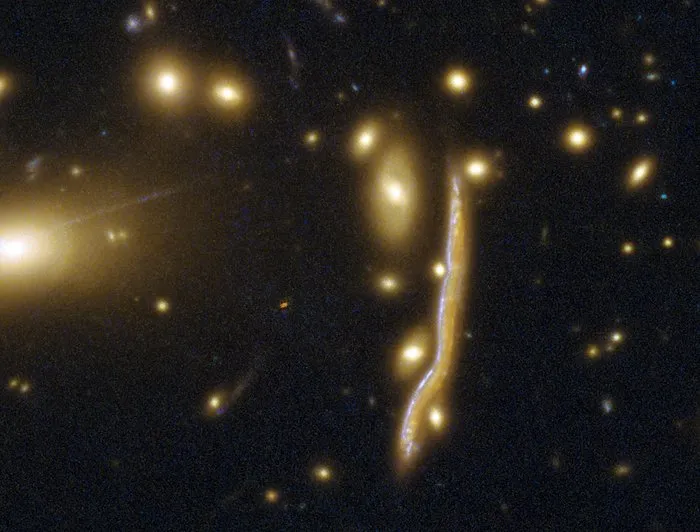 Изображение, полученное телескопом «Хаббл», показывает так называемую Космическую Змею — далёкую галактику с ярко выраженными узлами интенсивного звездообразования. Её изображение искажено эффектом гравитационного линзирования.