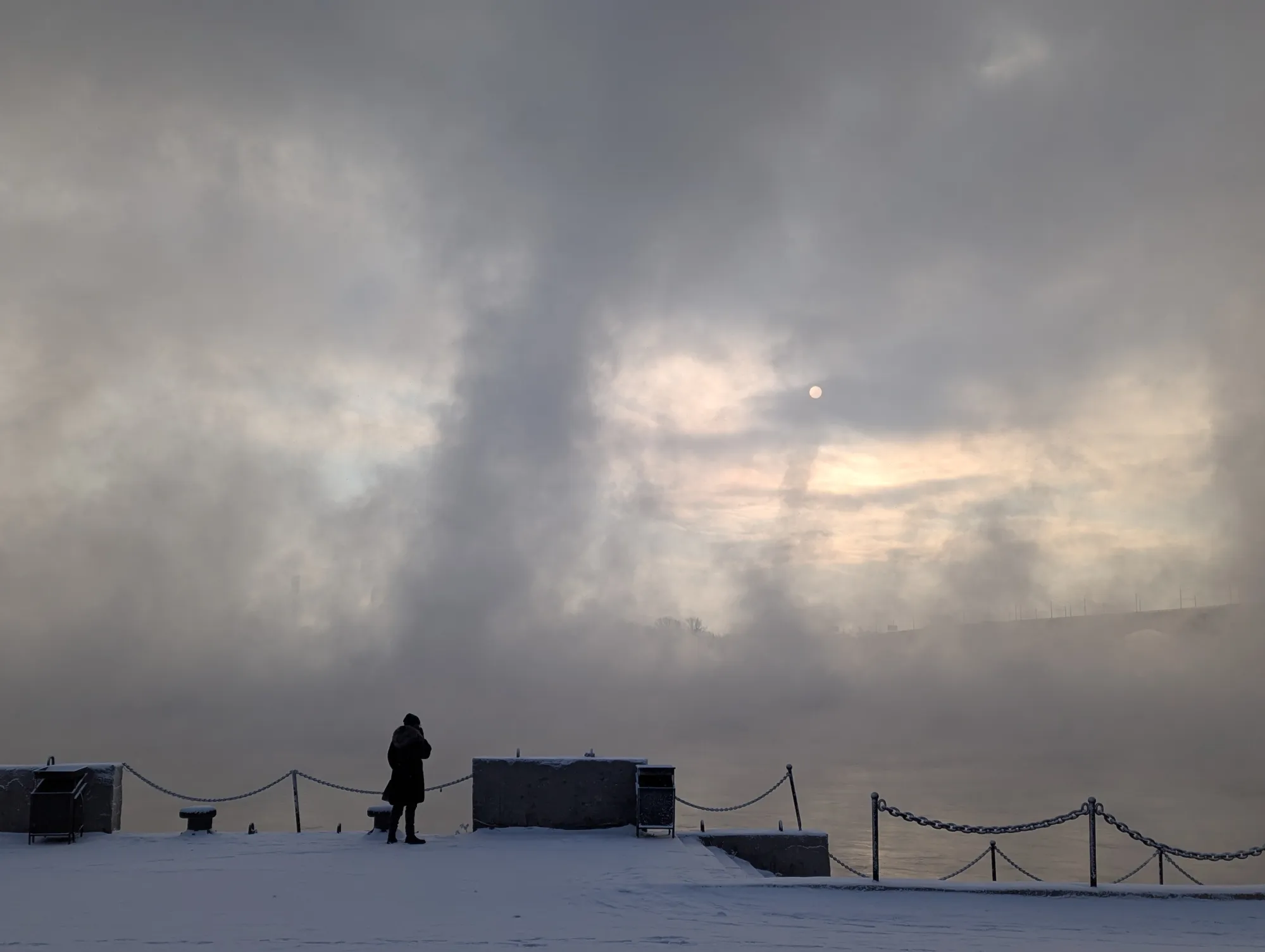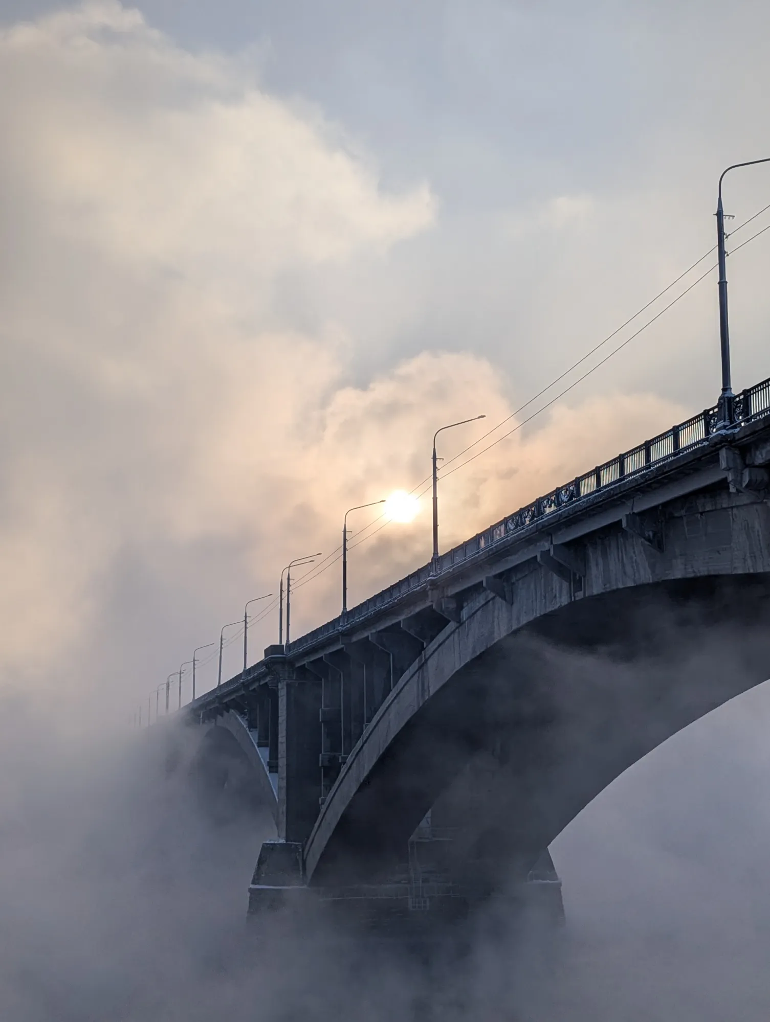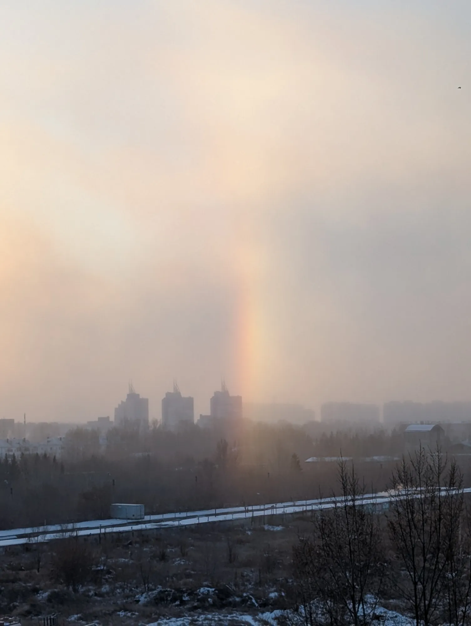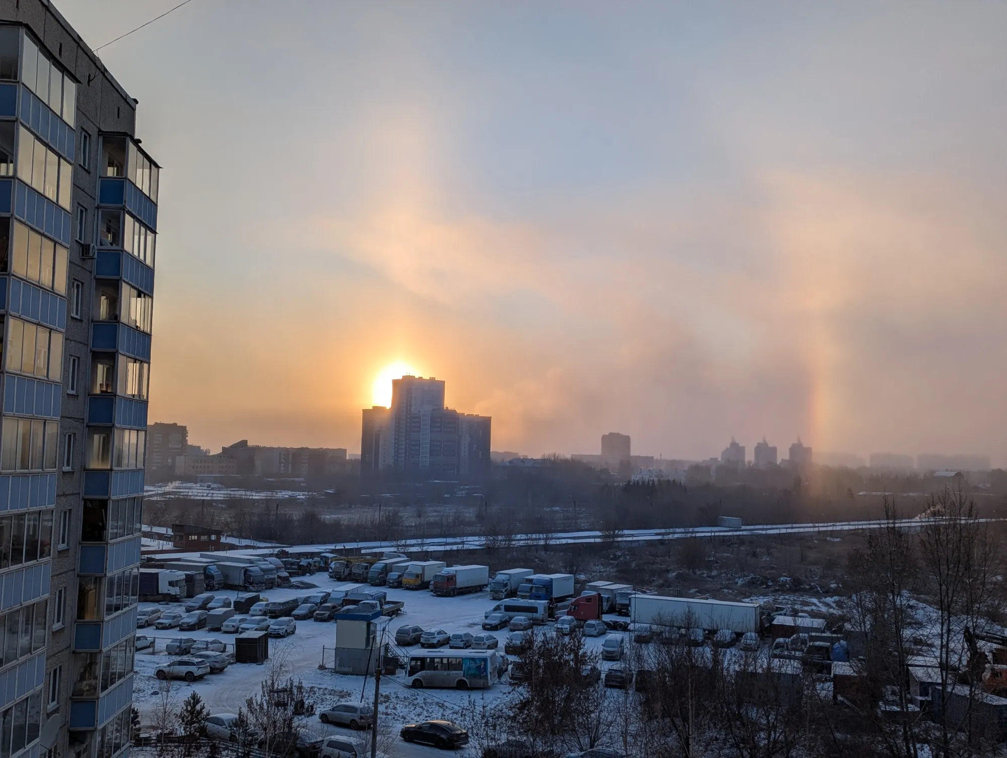 Гало – это по сути своей зимняя радуга, возникающая не от капель воды, а от кристалликов льда. Оно возникает вокруг солнца (не только, но в нашем случае так) в морозную погоду. У нас сегодня стукнул крепкий мороз, так что можем наблюдать это явление.