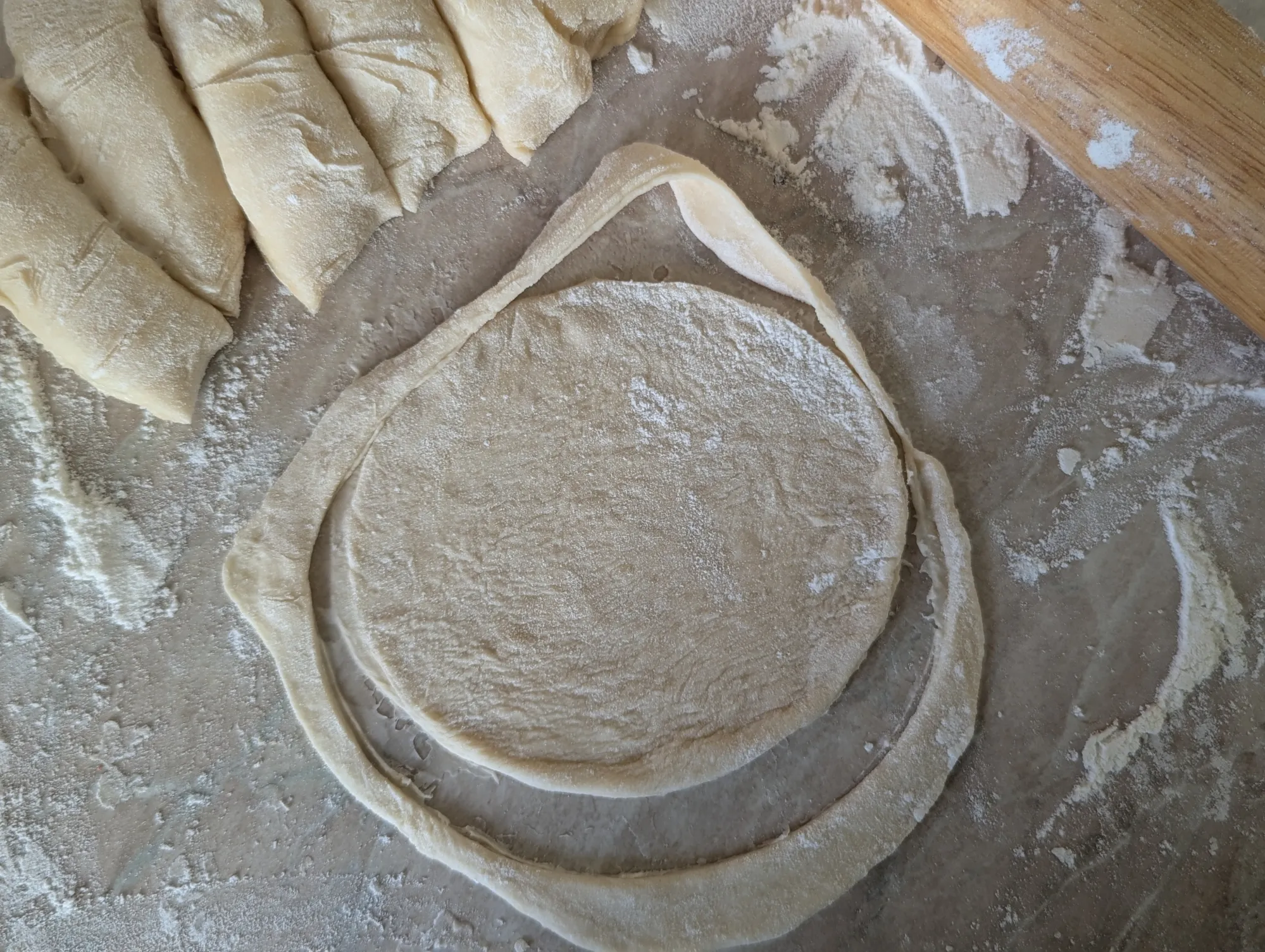 Тесто скатываю в колбаску и делю на равные кусочки. Каждый раскатываю в кружочек и для ровности отрезаю лишнее чашкой.