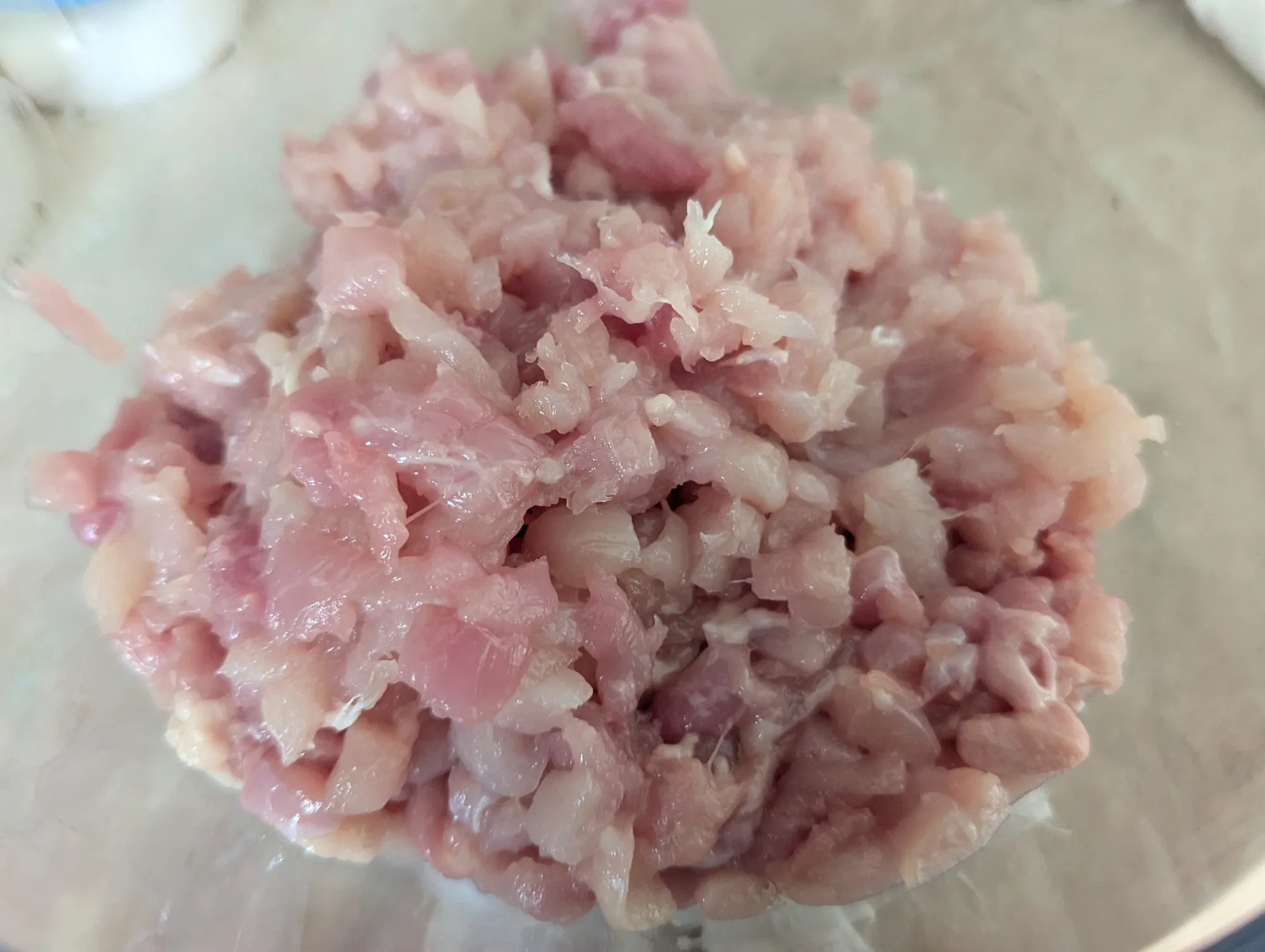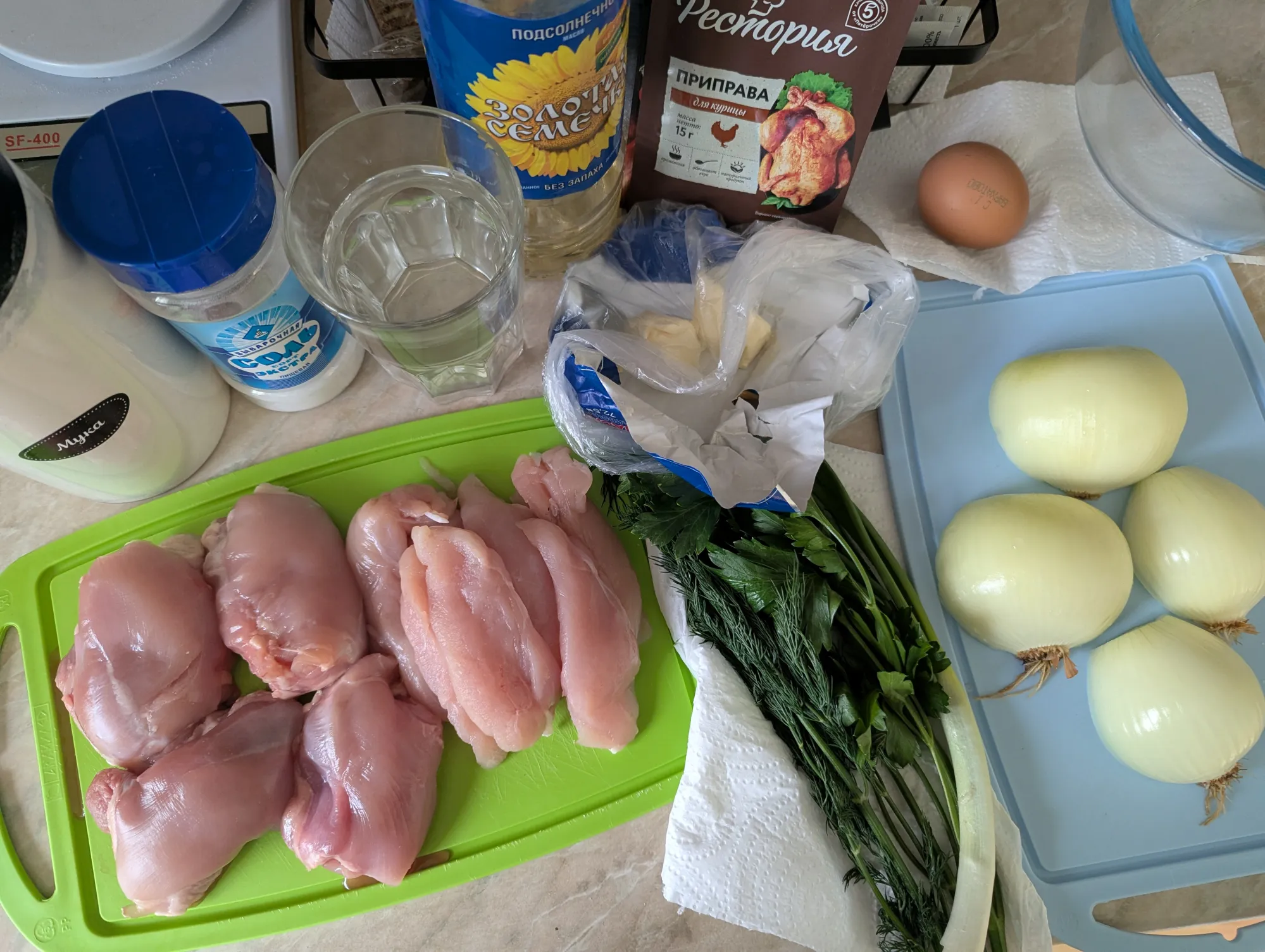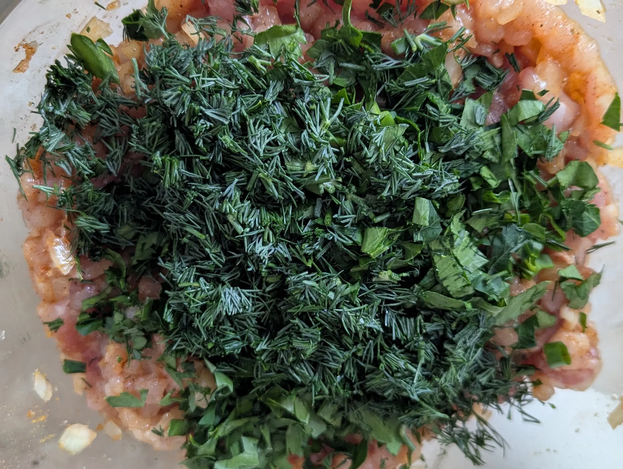 Курицу довольно мелко режу. Лук – так же, бонусом добавляю свои слёзы. Зелень режу как получится. Добавляю специи, соль и воду, всё хорошо перемешиваю и оставляю «подружиться».