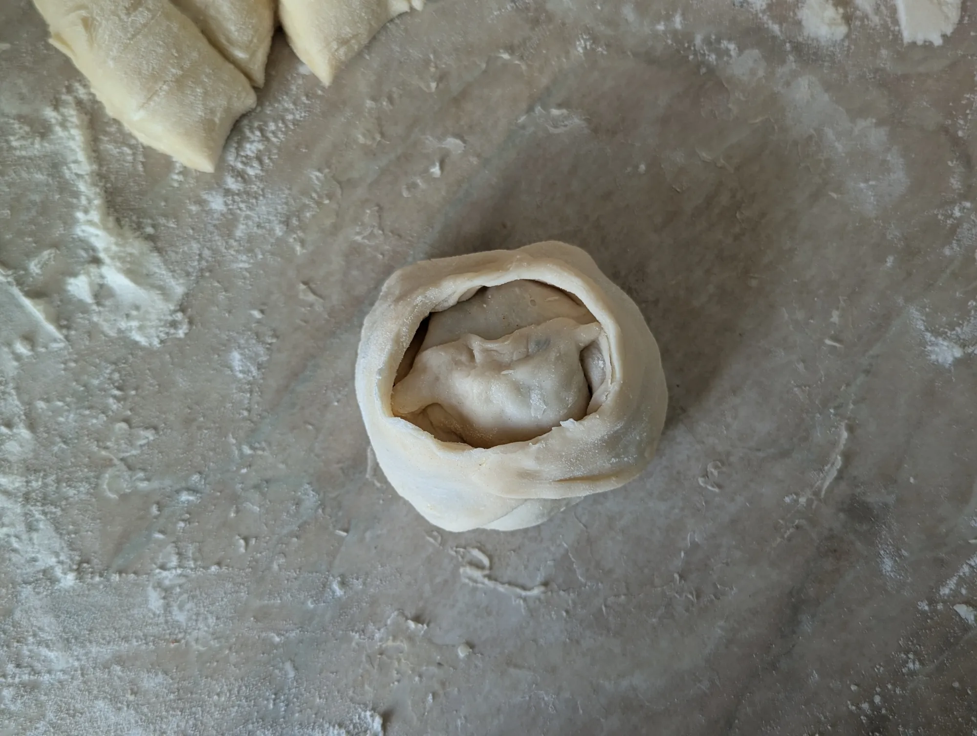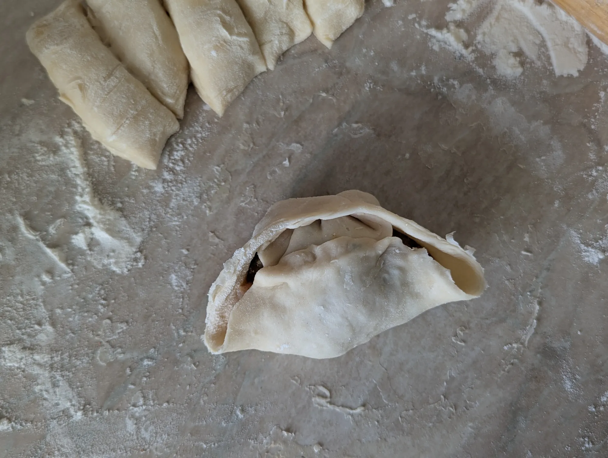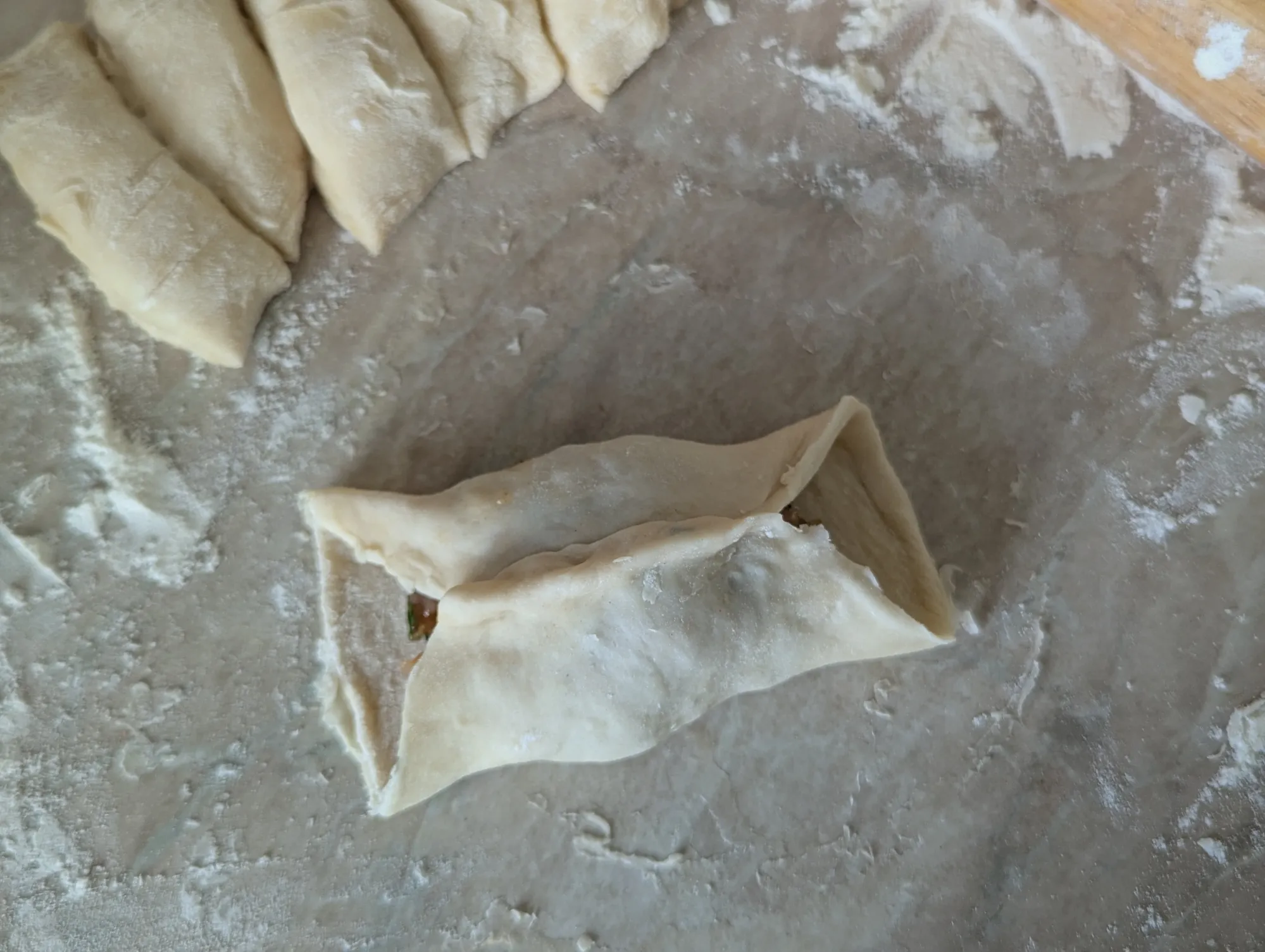 В середину кладу начинку, а затем защипываю: сначала две противоположные стороны, потом уголки.