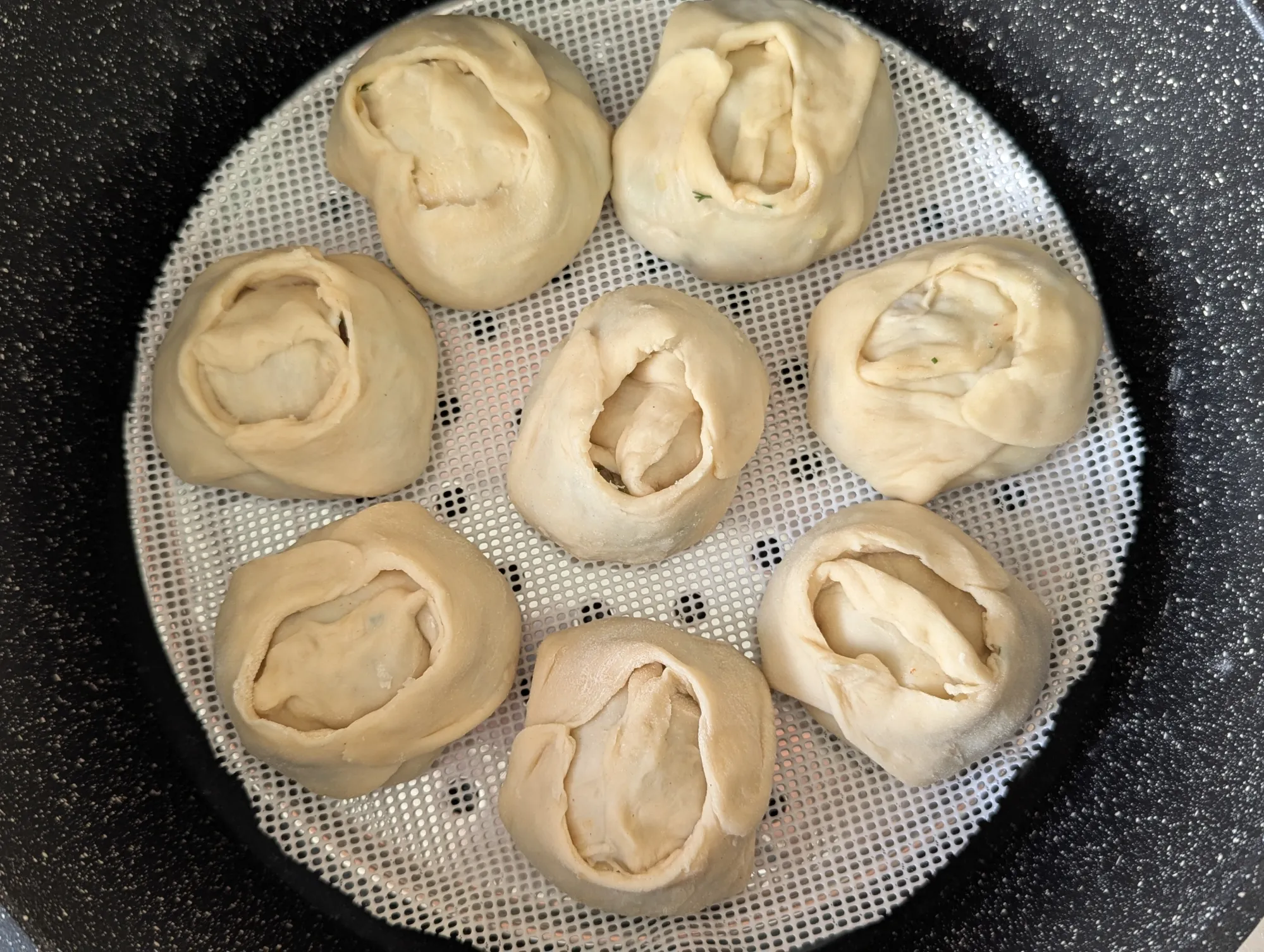 В кастрюлю наливаю воду, оставляю закипать. Будущие манты кладу в форму для варки на пару, ставлю эту конструкцию в воду и закрываю крышкой. Вроде можно пойти отдохнуть полчасика...